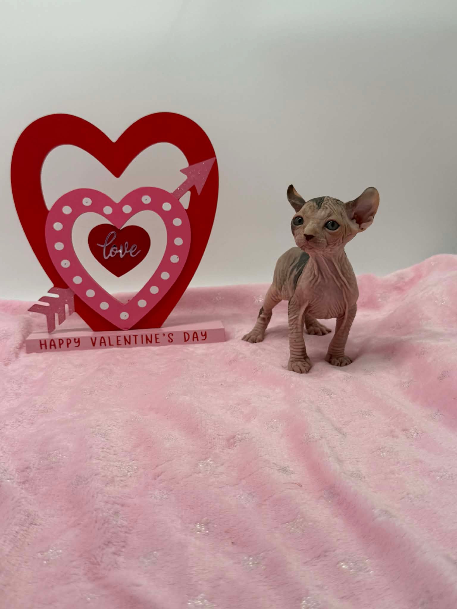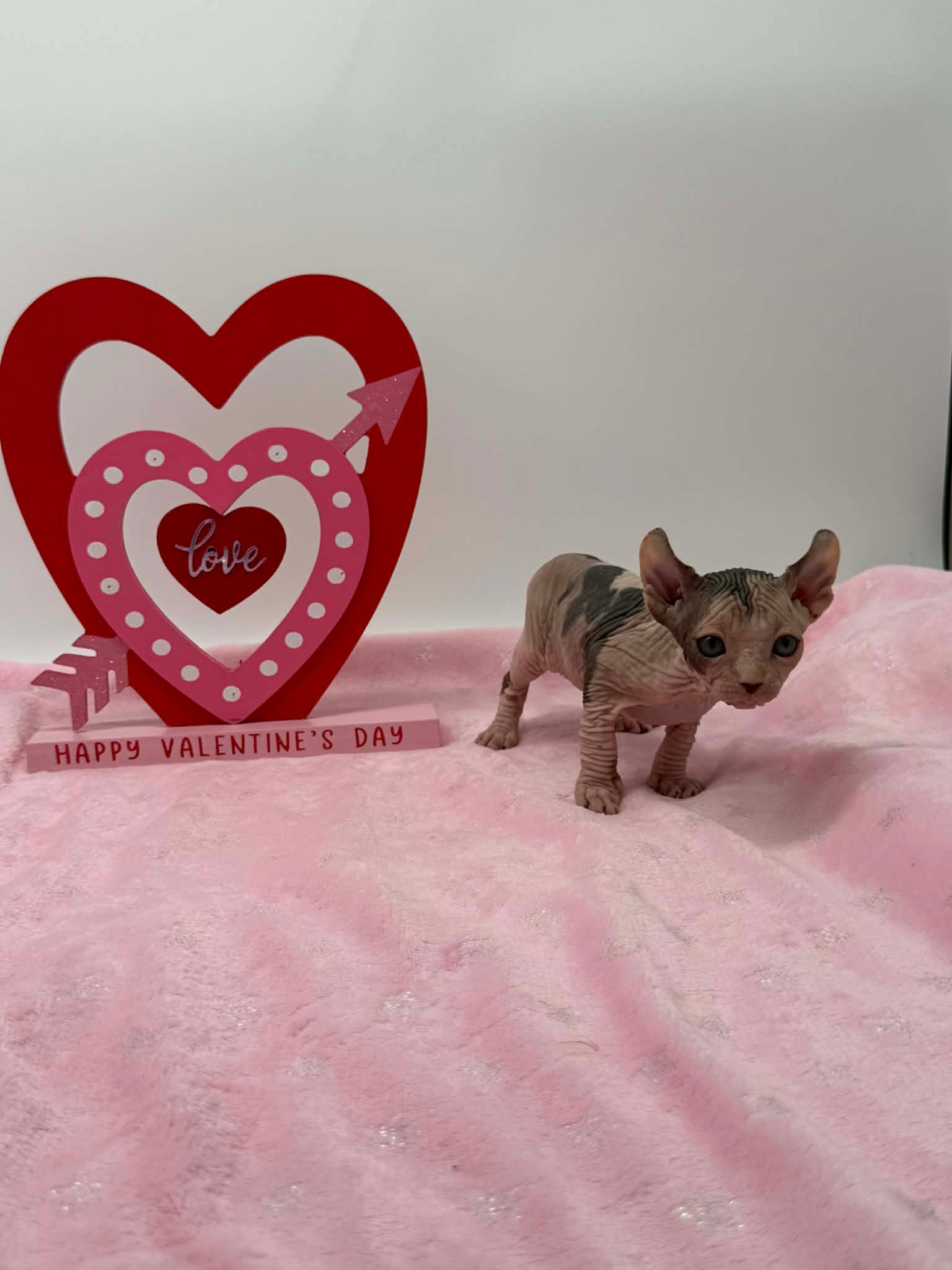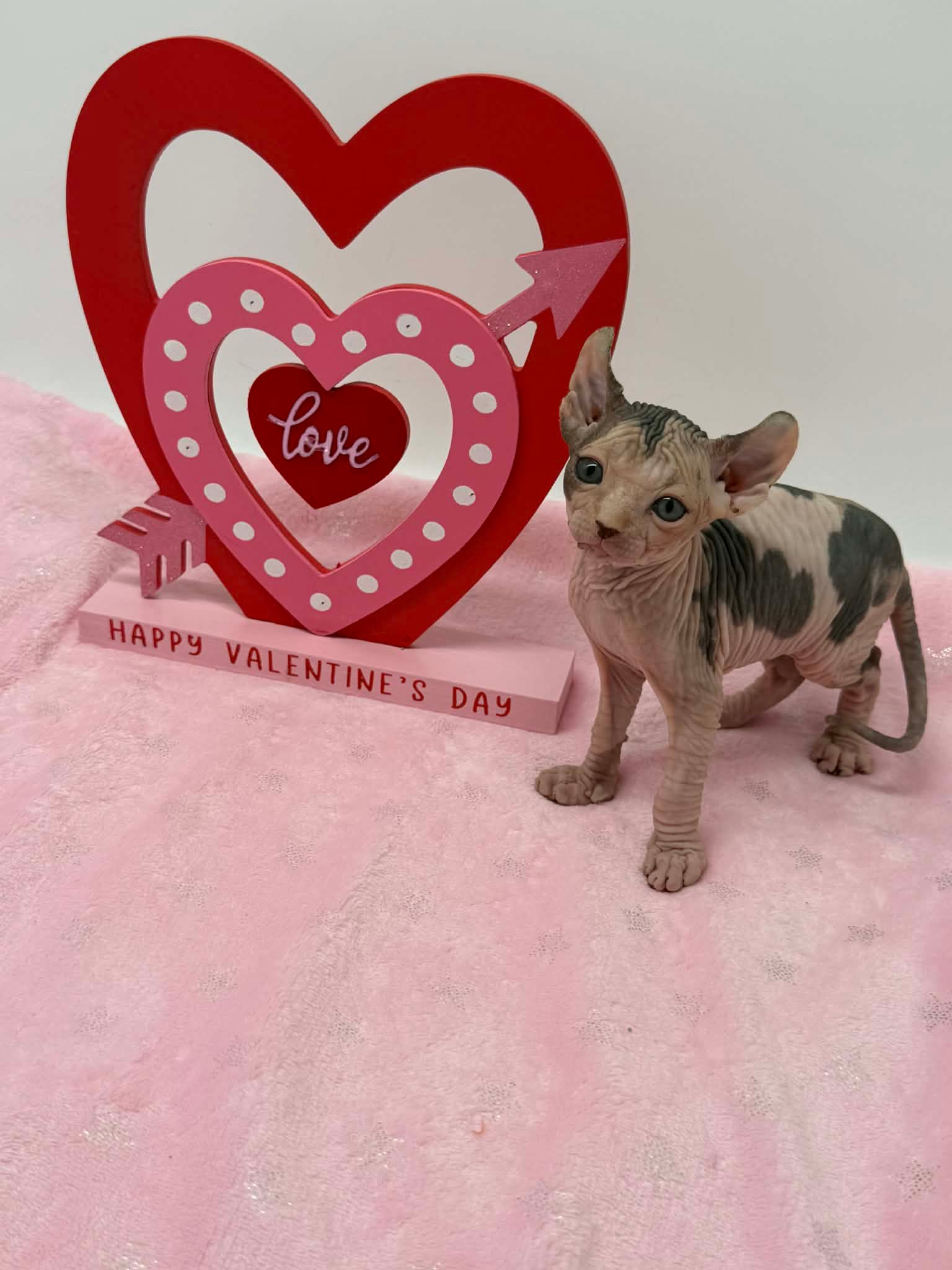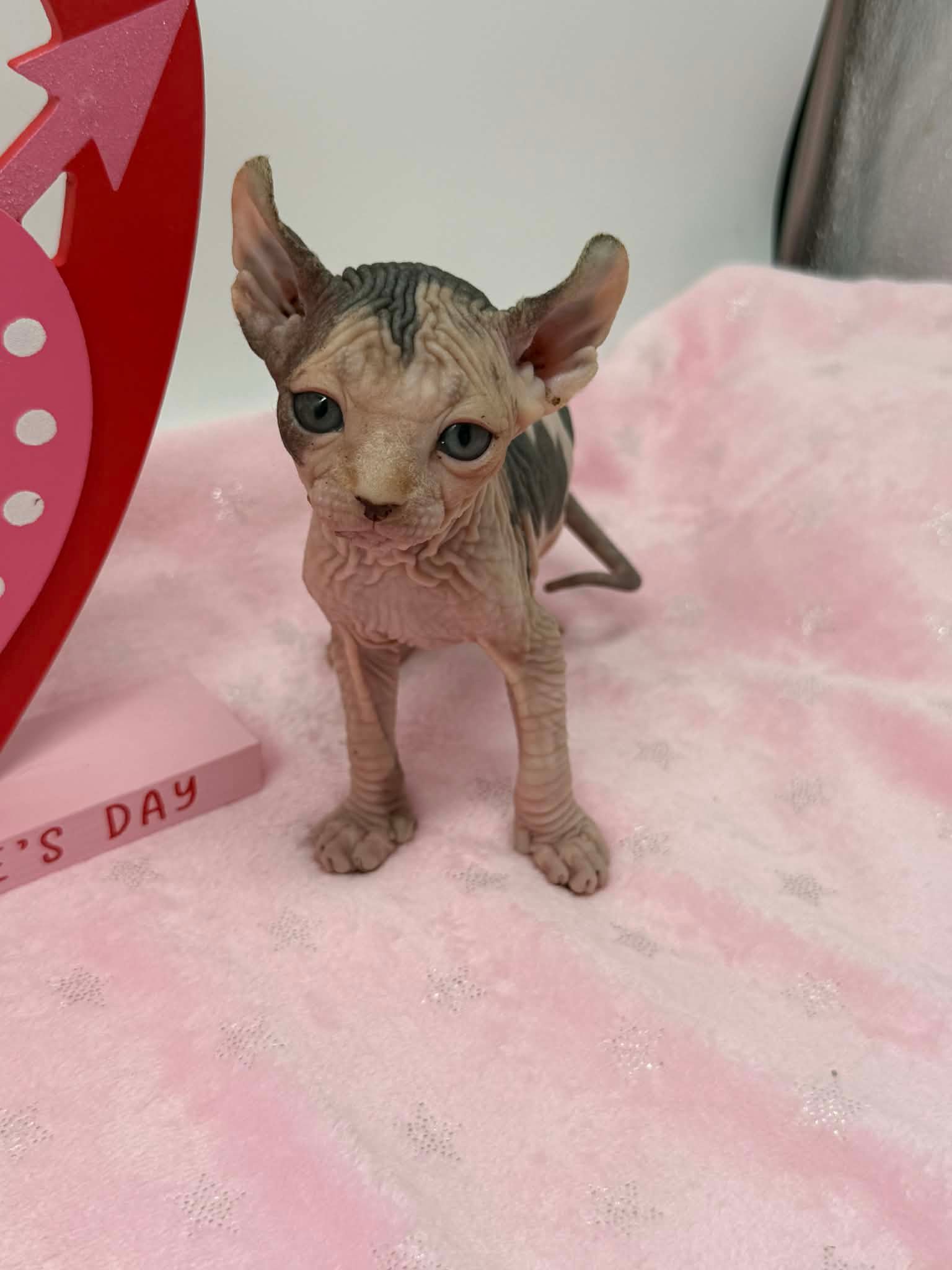 Purradox Essence is a charming calico Elf Sphynx with glowing yellow-green eyes and the sweetest little soul. She has a warm, comforting presence and a personality that feels like a gentle hug. Essence loves being close to her people and has a natural way of making everyone around her feel calm and happy. This sweet girl enjoys affection, cozy moments, and quiet companionship. Whether sheโ€™s curled up beside you or softly watching the world with her expressive eyes, Essence radiates kindness and contentment. Her calm yet loving nature makes her a wonderful choice for a home looking for a truly affectionate and emotionally connected Sphynx. Essence is the kind of kitten who melts into your heart effortlessly and brings a sense of peace, love, and sweetness to everyday life.