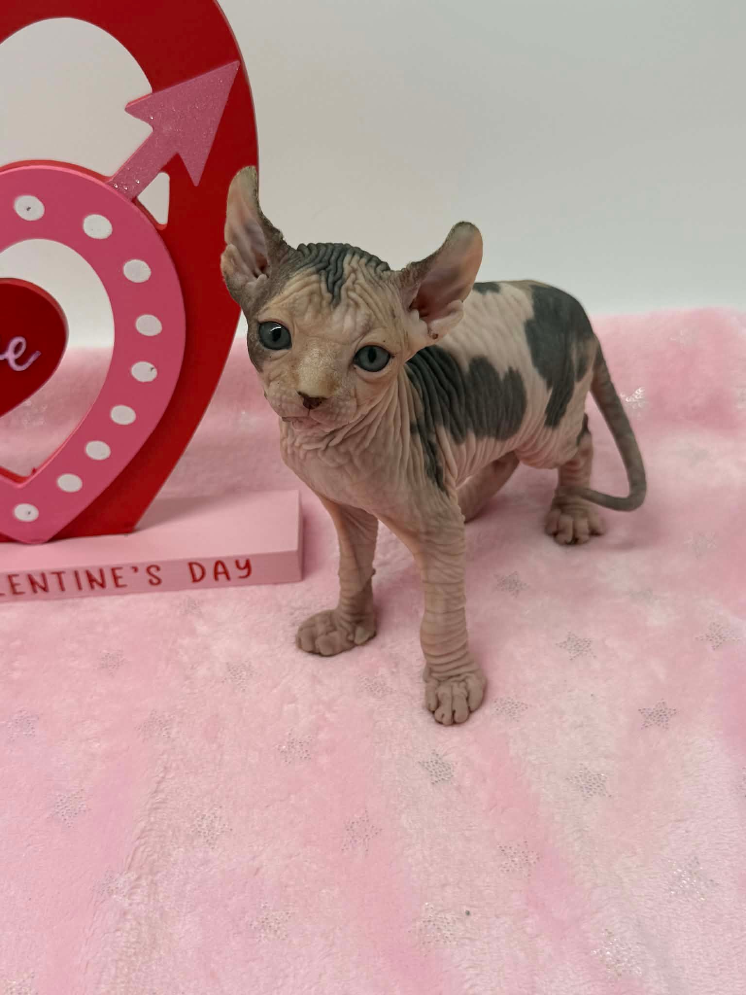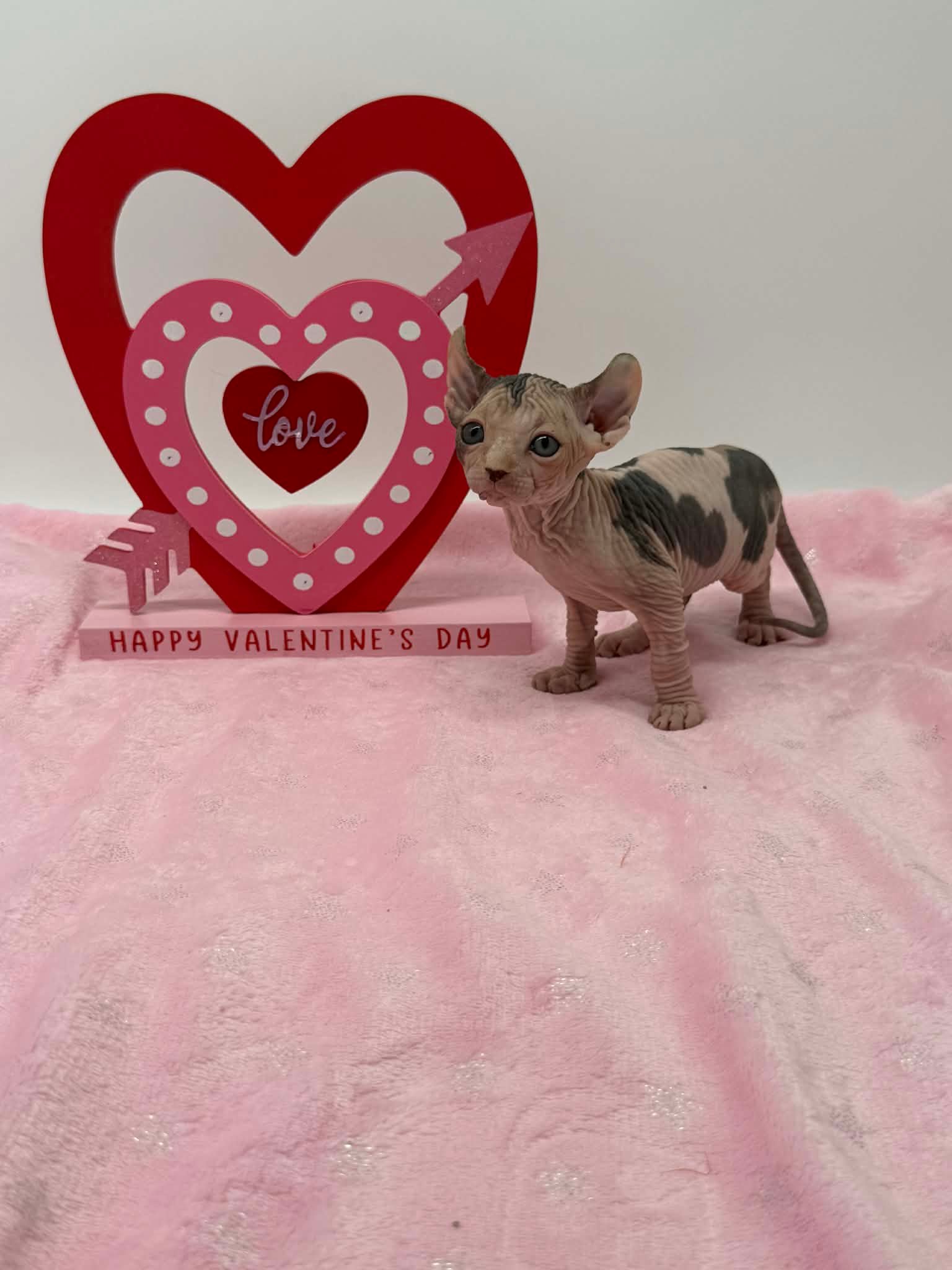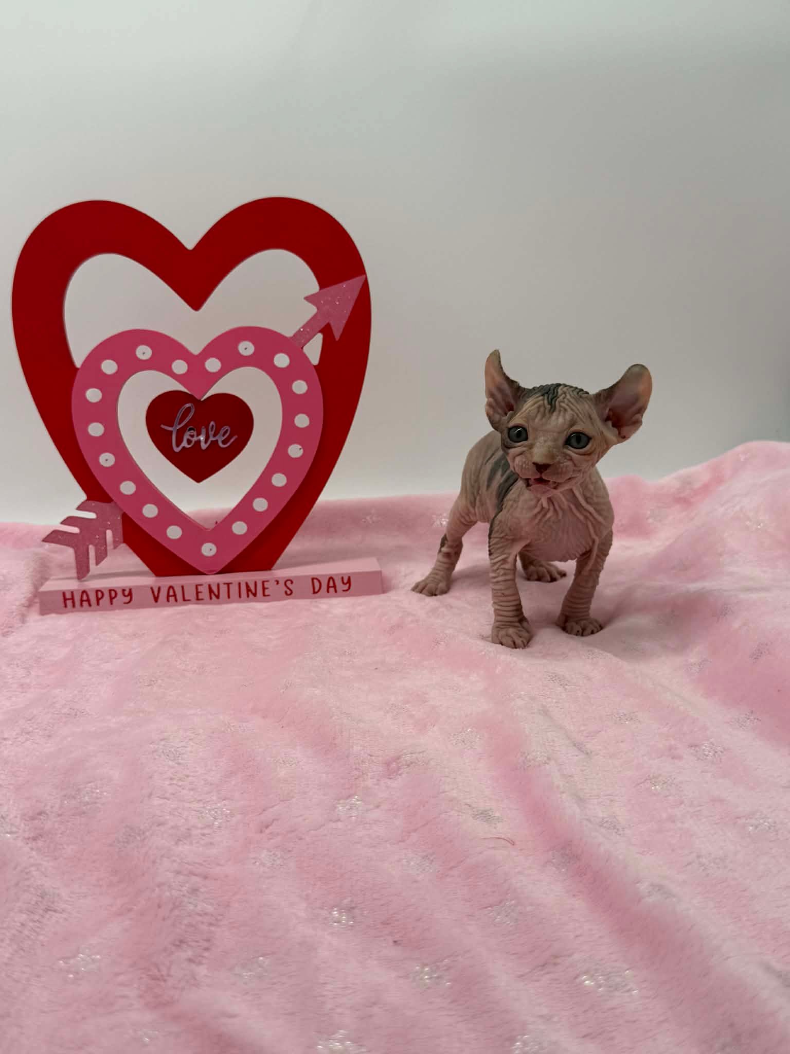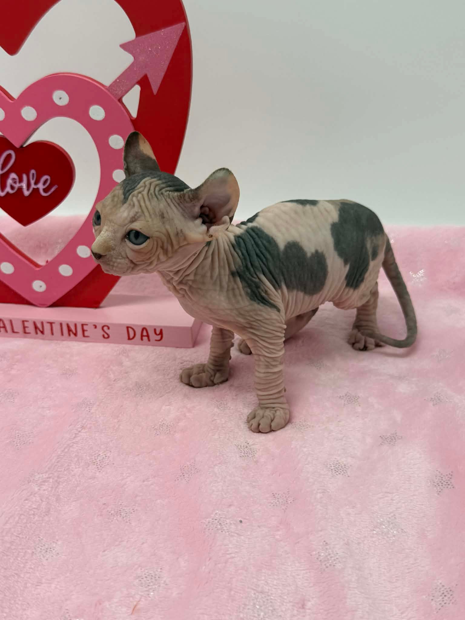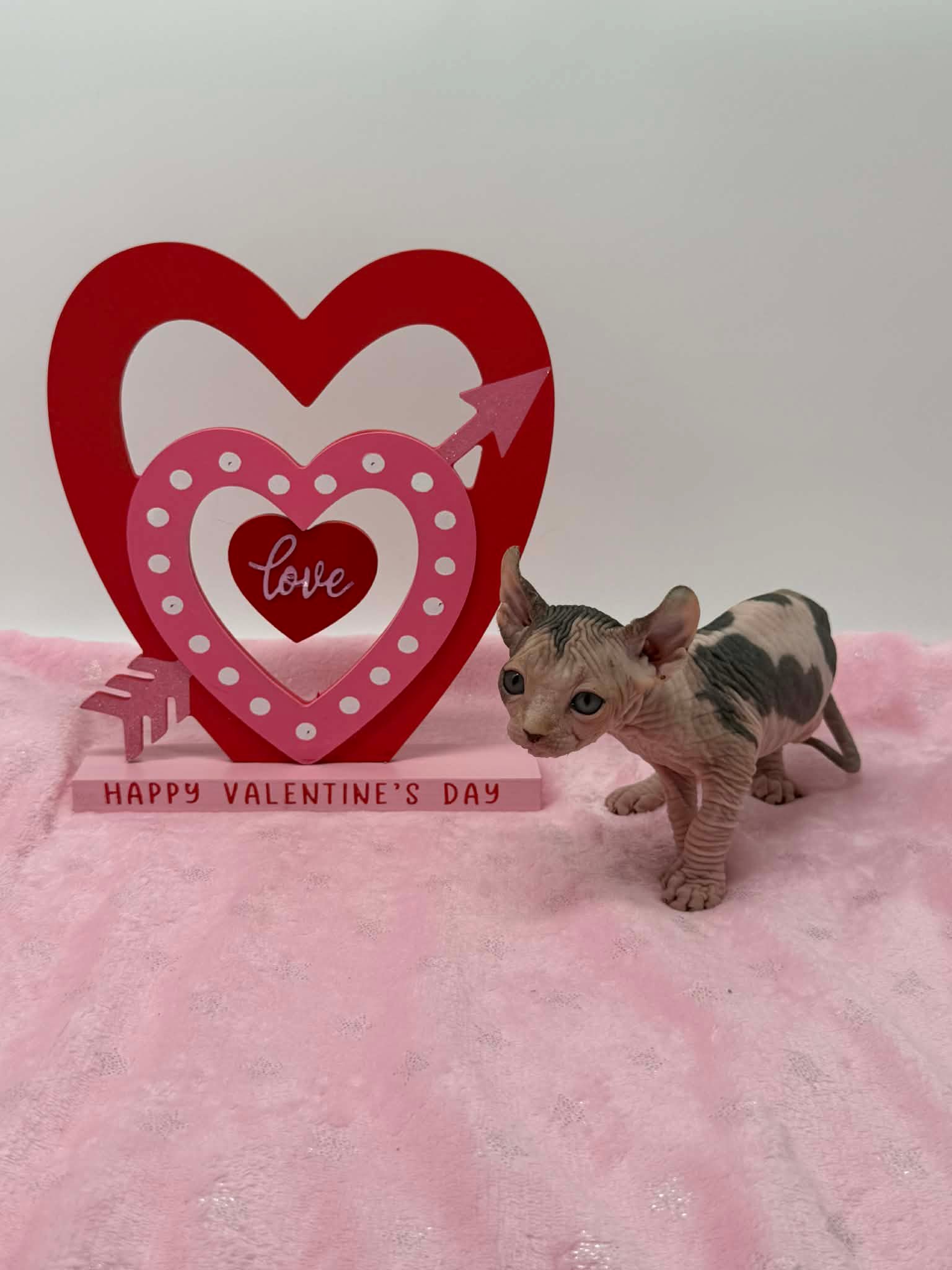 Purradox Essence is a charming calico Elf Sphynx with glowing yellow-green eyes and the sweetest little soul. She has a warm, comforting presence and a personality that feels like a gentle hug. Essence loves being close to her people and has a natural way of making everyone around her feel calm and happy. This sweet girl enjoys affection, cozy moments, and quiet companionship. Whether sheโ€™s curled up beside you or softly watching the world with her expressive eyes, Essence radiates kindness and contentment. Her calm yet loving nature makes her a wonderful choice for a home looking for a truly affectionate and emotionally connected Sphynx. Essence is the kind of kitten who melts into your heart effortlessly and brings a sense of peace, love, and sweetness to everyday life.
