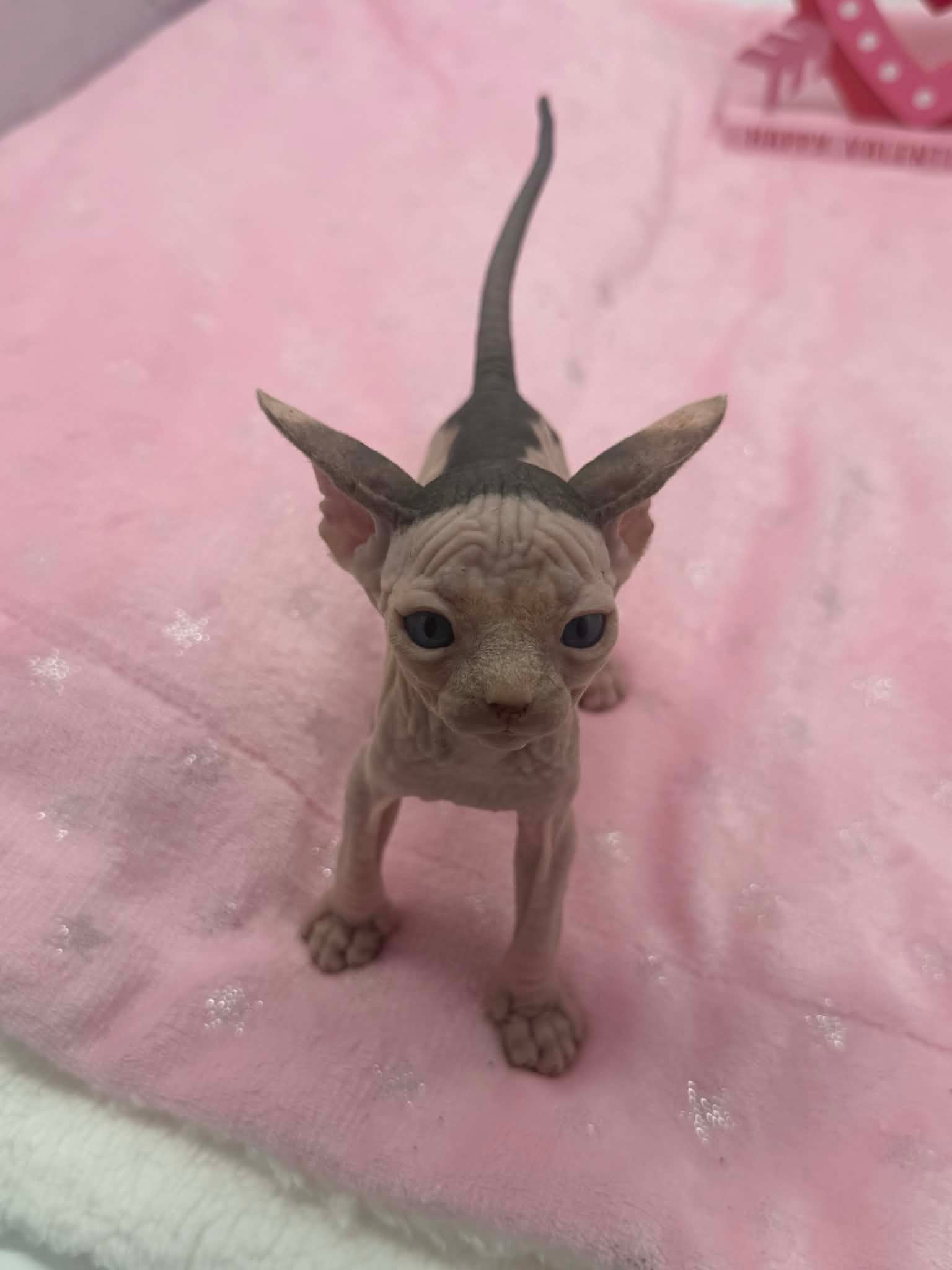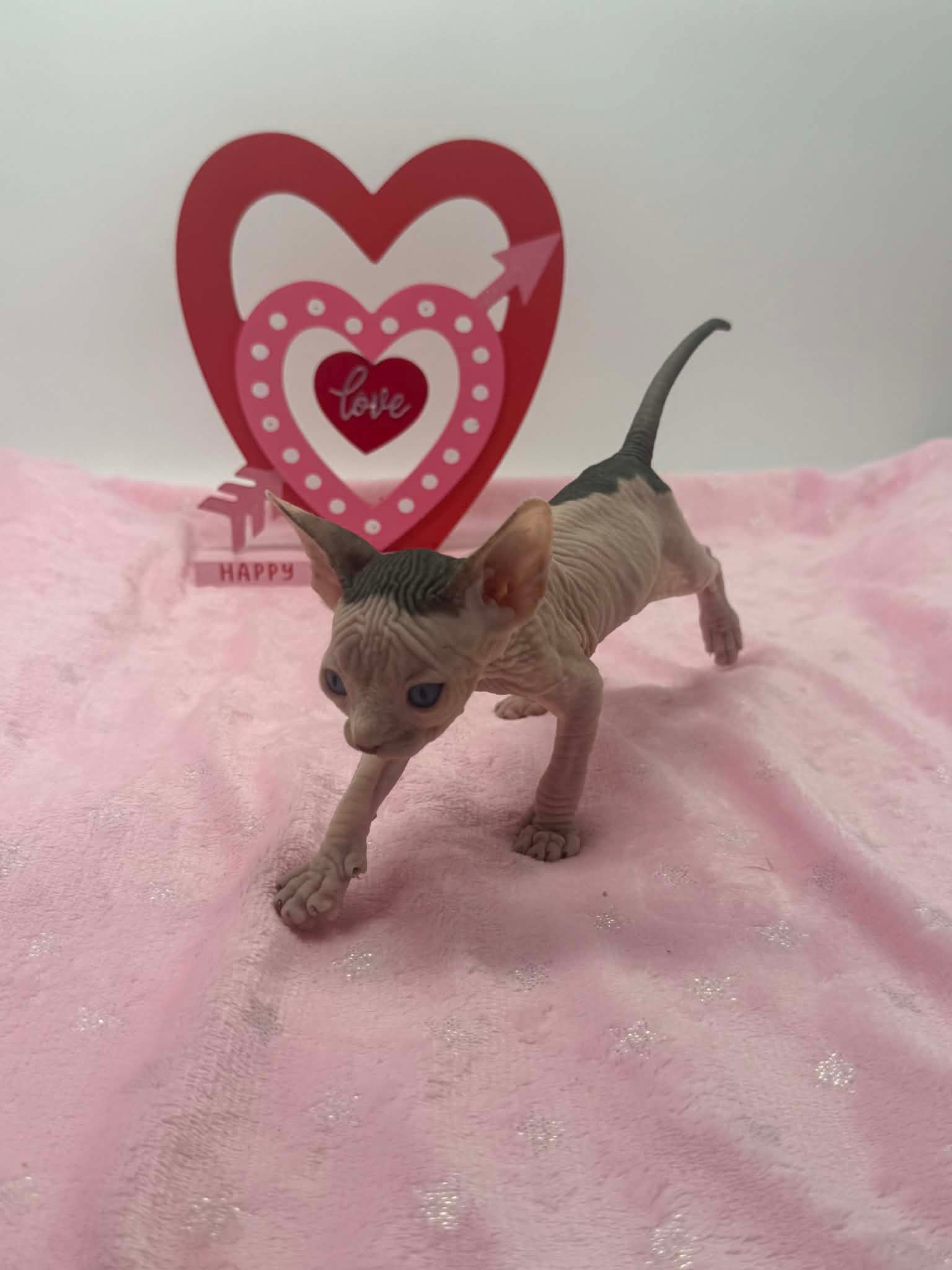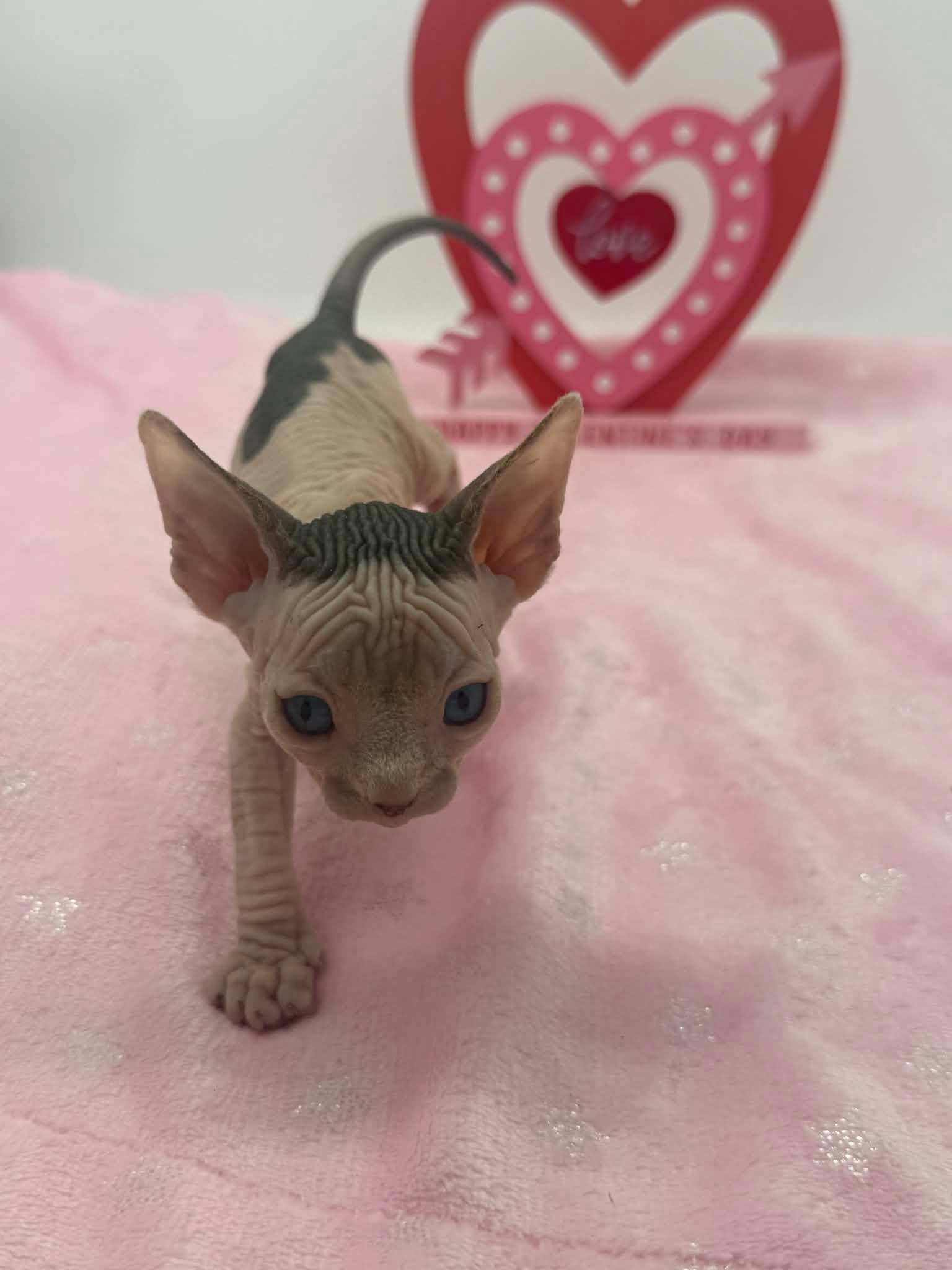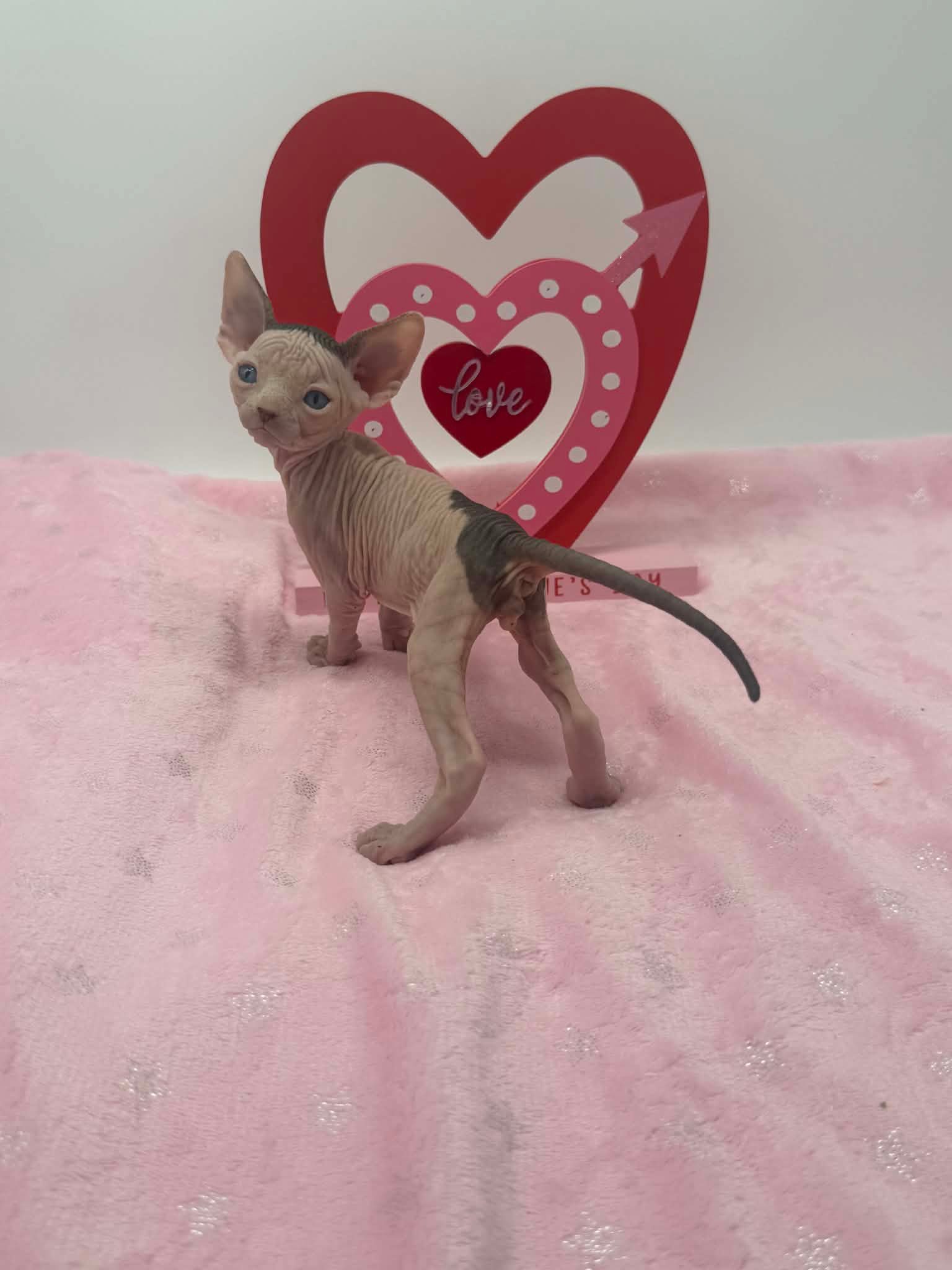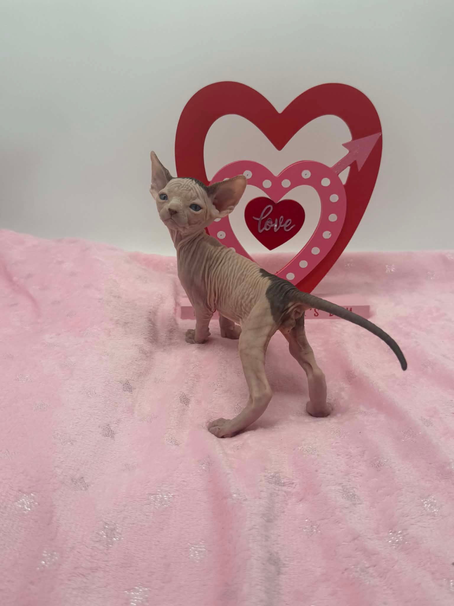 Halo is a stunning black bicolor Dominant Blue Eye Sphynx male with captivating blue eyes and an exceptionally gentle nature. He has a relaxed, easygoing personality and brings a calming presence wherever he goes. This sweet boy enjoys affection without being demanding. He loves being held, settles comfortably into your arms, and offers soft purrs and soulful looks in return. Halo is the type of kitten who thrives on connection and companionship, making him a wonderful choice for someone seeking a loving and emotionally intuitive Sphynx. With his serene demeanor and angelic expression, Halo is a truly special kitten who will fit beautifully into a peaceful, affectionate home.