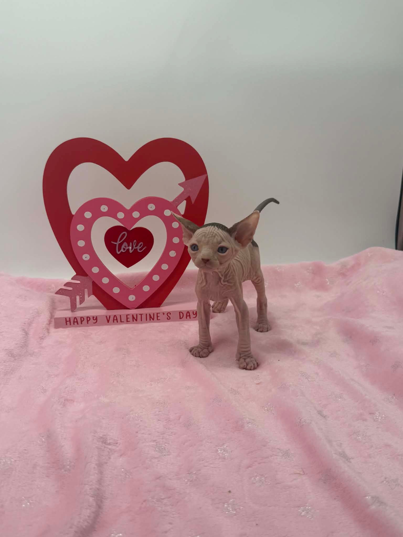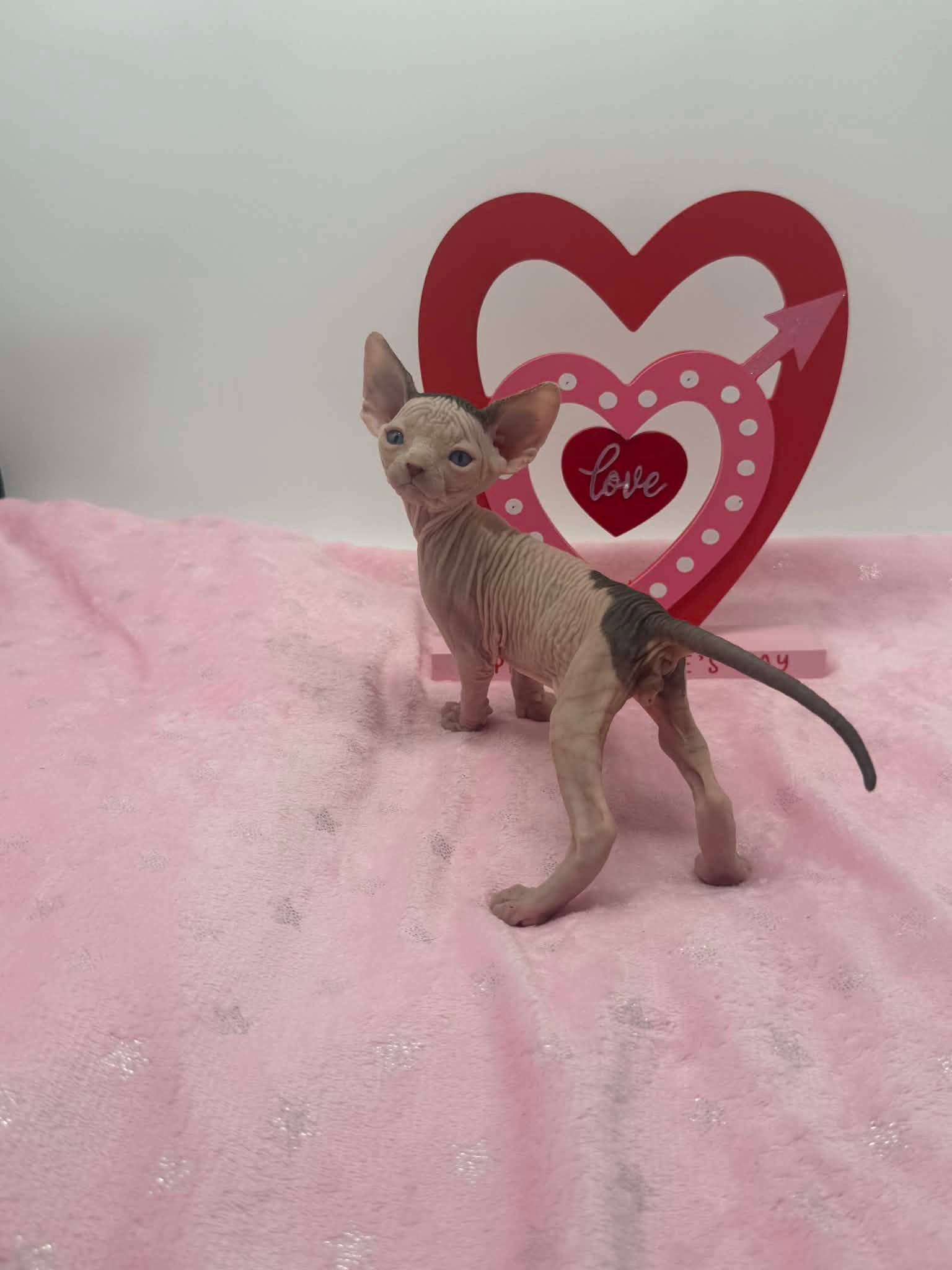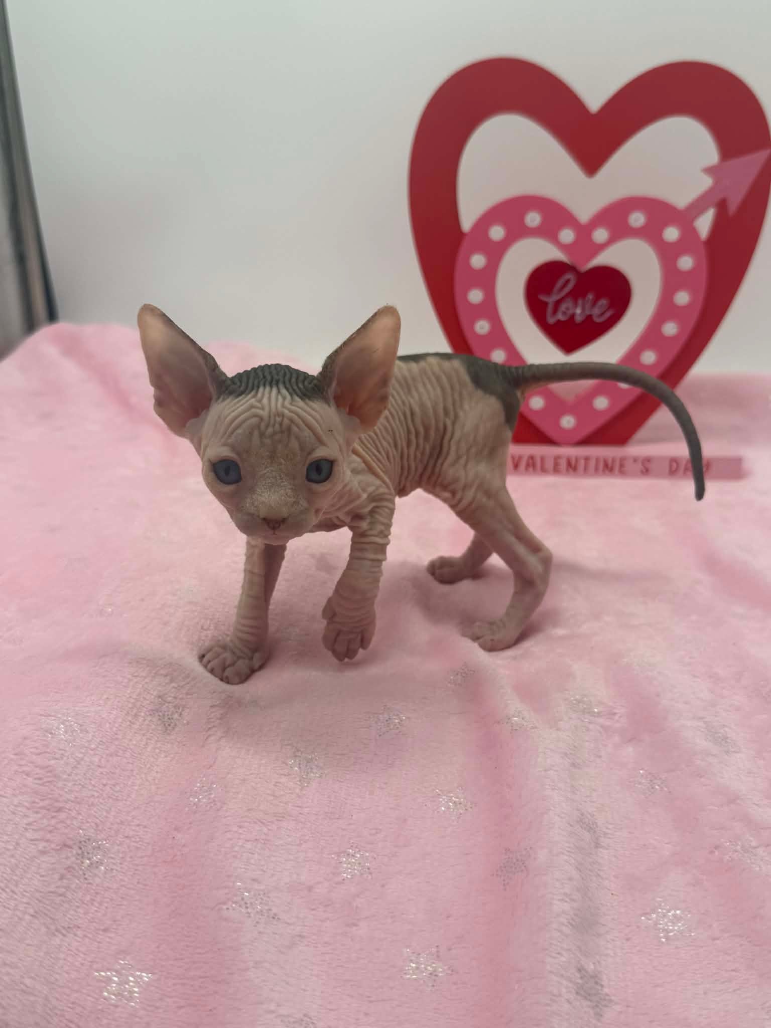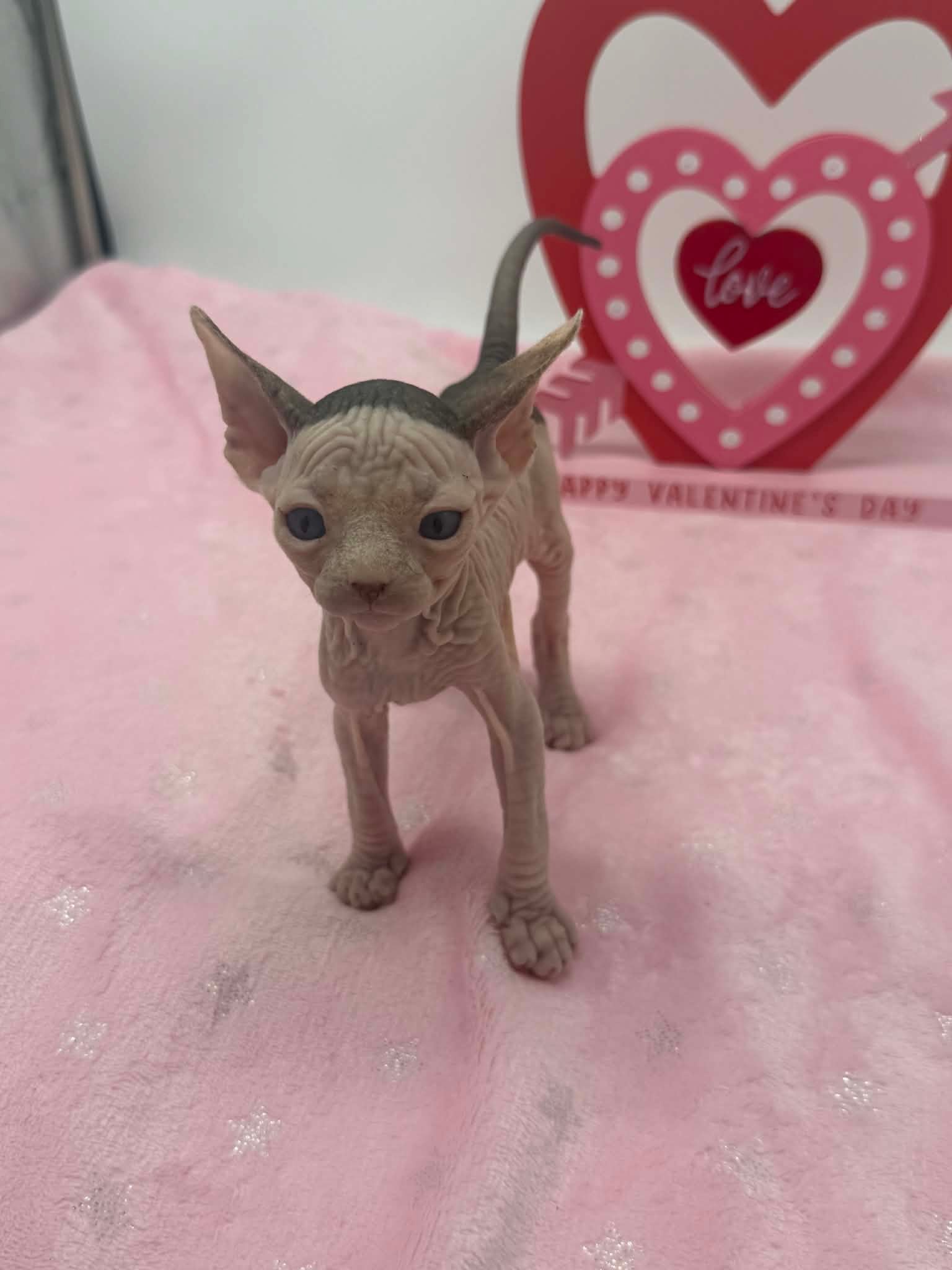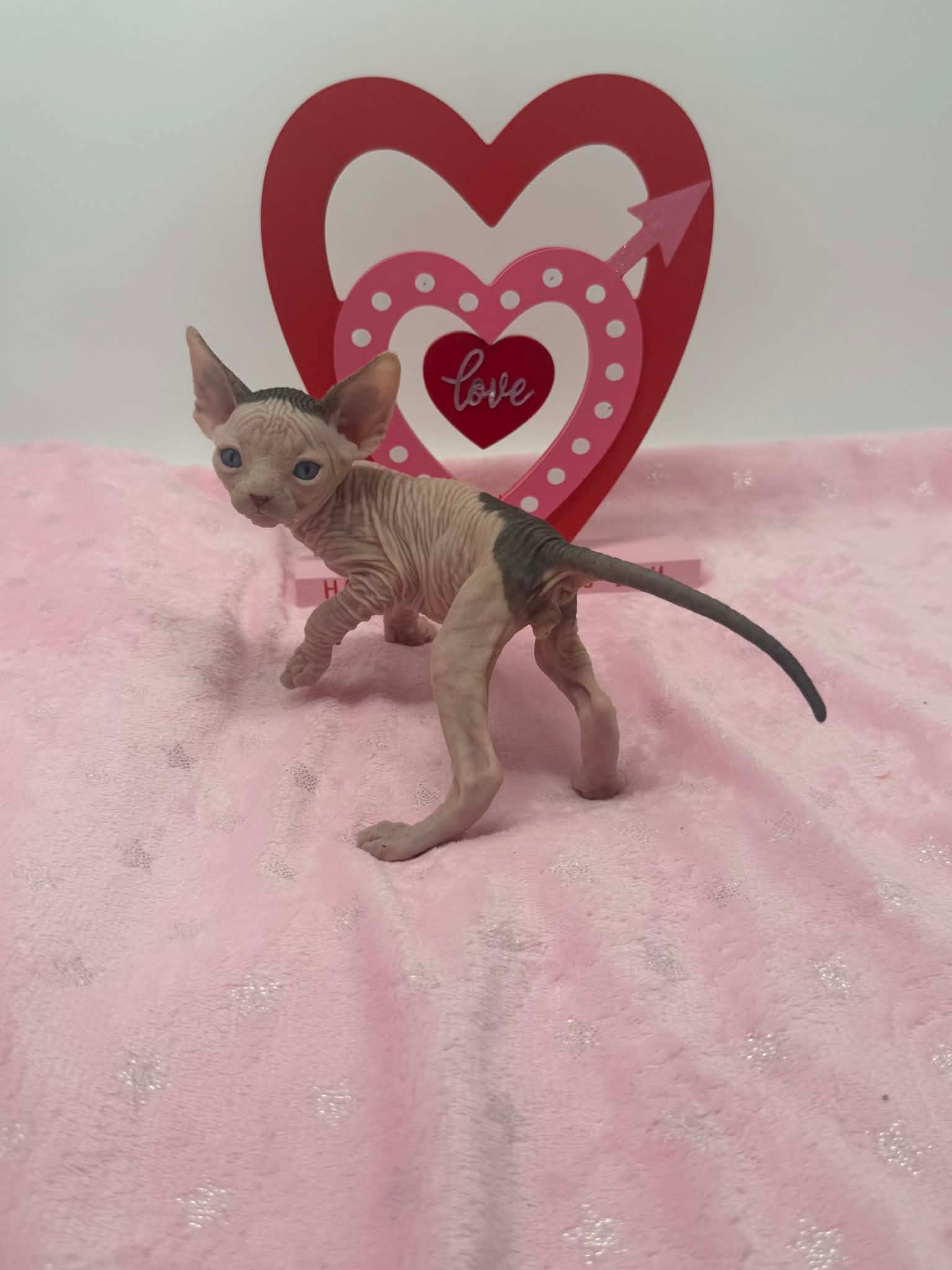 Halo is a stunning black bicolor Dominant Blue Eye Sphynx male with captivating blue eyes and an exceptionally gentle nature. He has a relaxed, easygoing personality and brings a calming presence wherever he goes. This sweet boy enjoys affection without being demanding. He loves being held, settles comfortably into your arms, and offers soft purrs and soulful looks in return. Halo is the type of kitten who thrives on connection and companionship, making him a wonderful choice for someone seeking a loving and emotionally intuitive Sphynx. With his serene demeanor and angelic expression, Halo is a truly special kitten who will fit beautifully into a peaceful, affectionate home.
