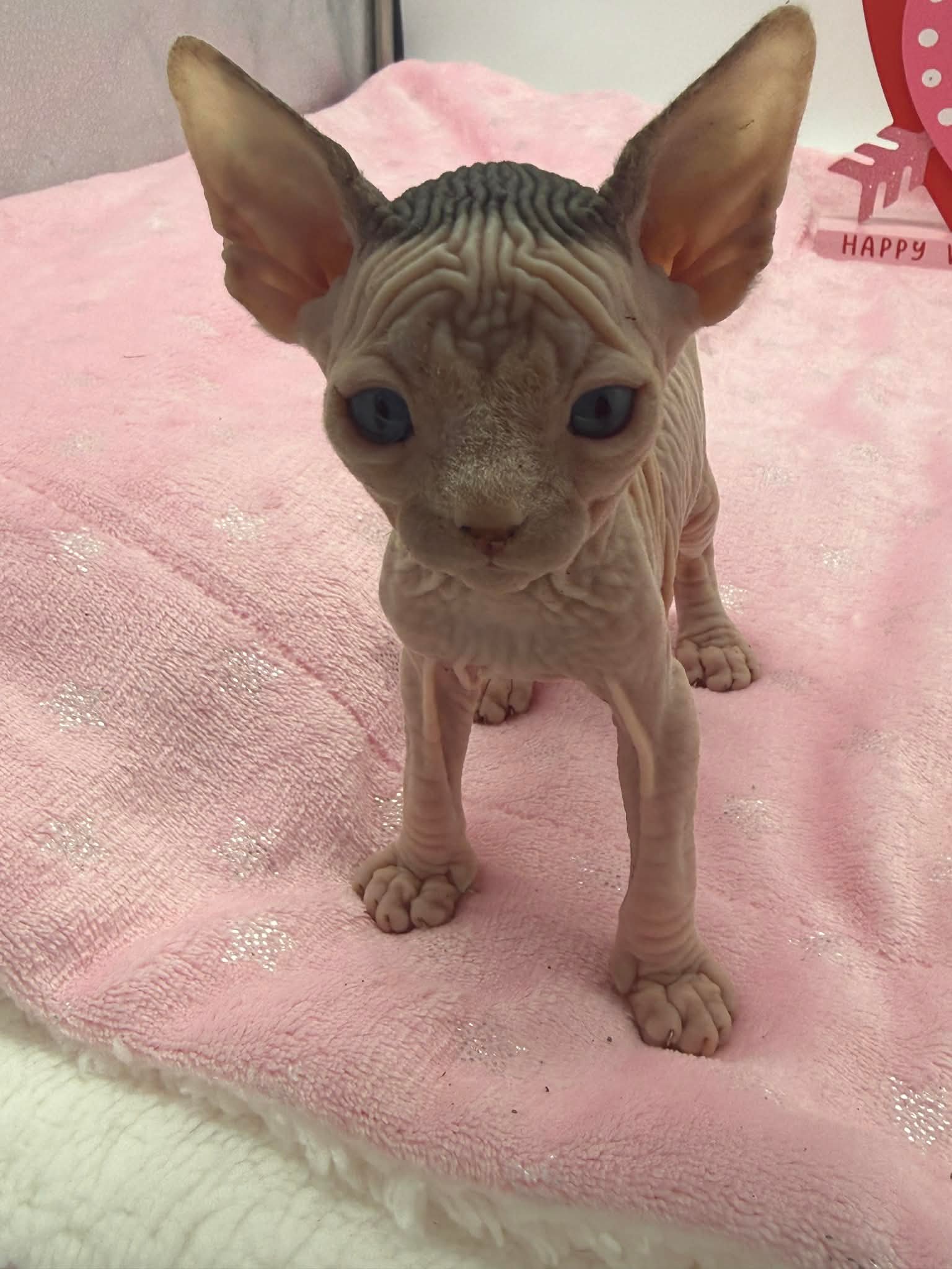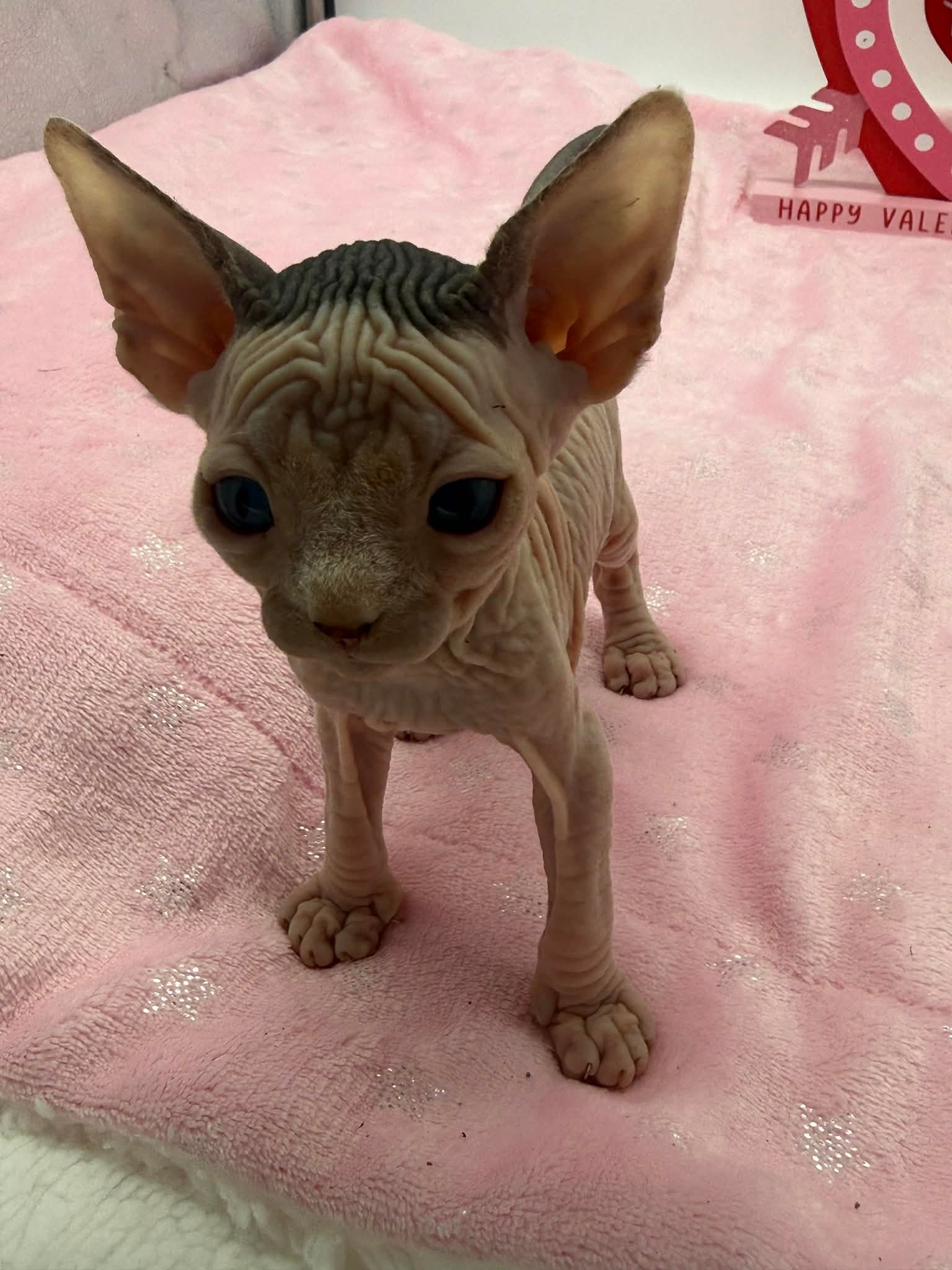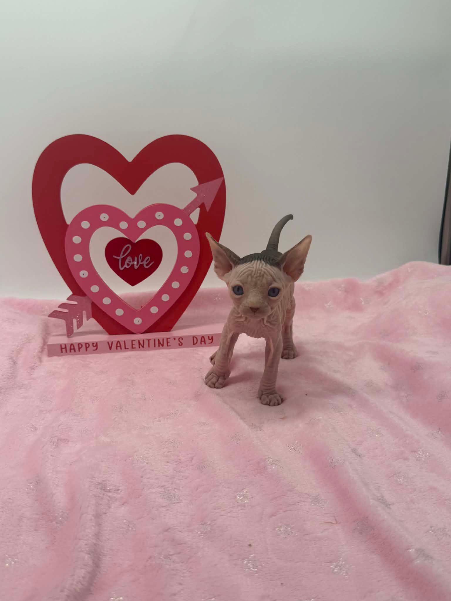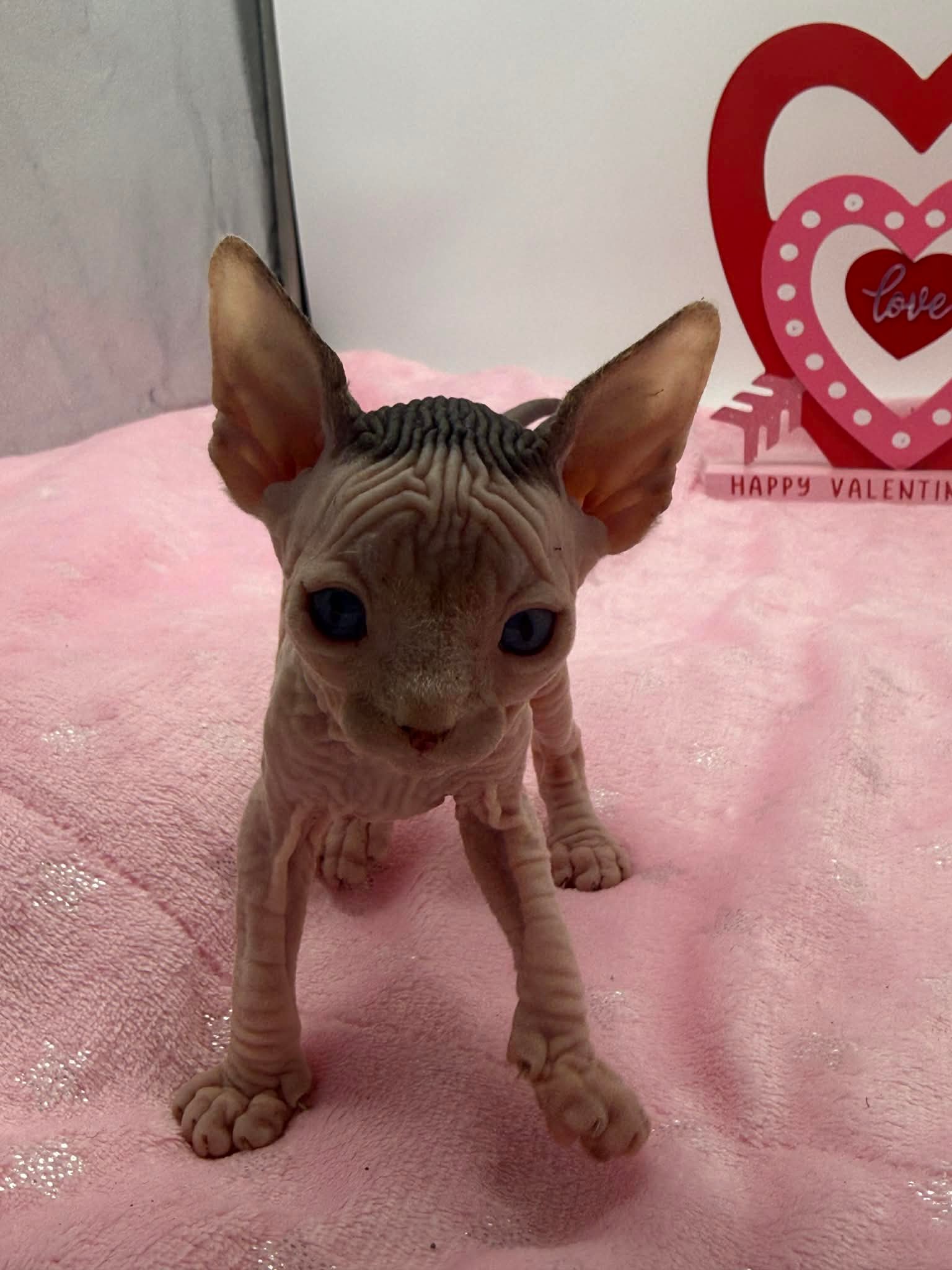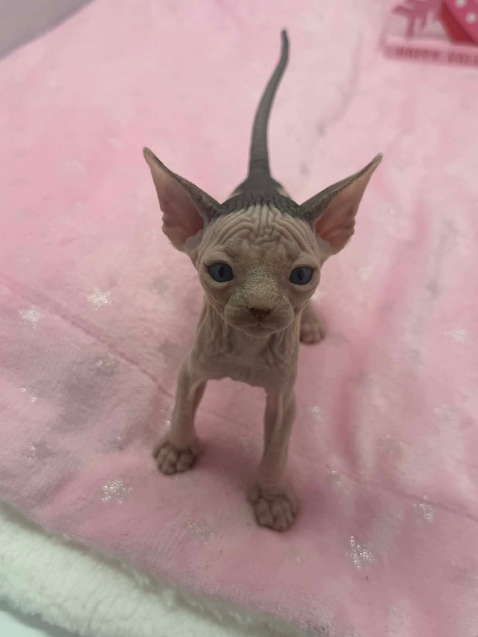 Halo is a stunning black bicolor Dominant Blue Eye Sphynx male with captivating blue eyes and an exceptionally gentle nature. He has a relaxed, easygoing personality and brings a calming presence wherever he goes. This sweet boy enjoys affection without being demanding. He loves being held, settles comfortably into your arms, and offers soft purrs and soulful looks in return. Halo is the type of kitten who thrives on connection and companionship, making him a wonderful choice for someone seeking a loving and emotionally intuitive Sphynx. With his serene demeanor and angelic expression, Halo is a truly special kitten who will fit beautifully into a peaceful, affectionate home.
