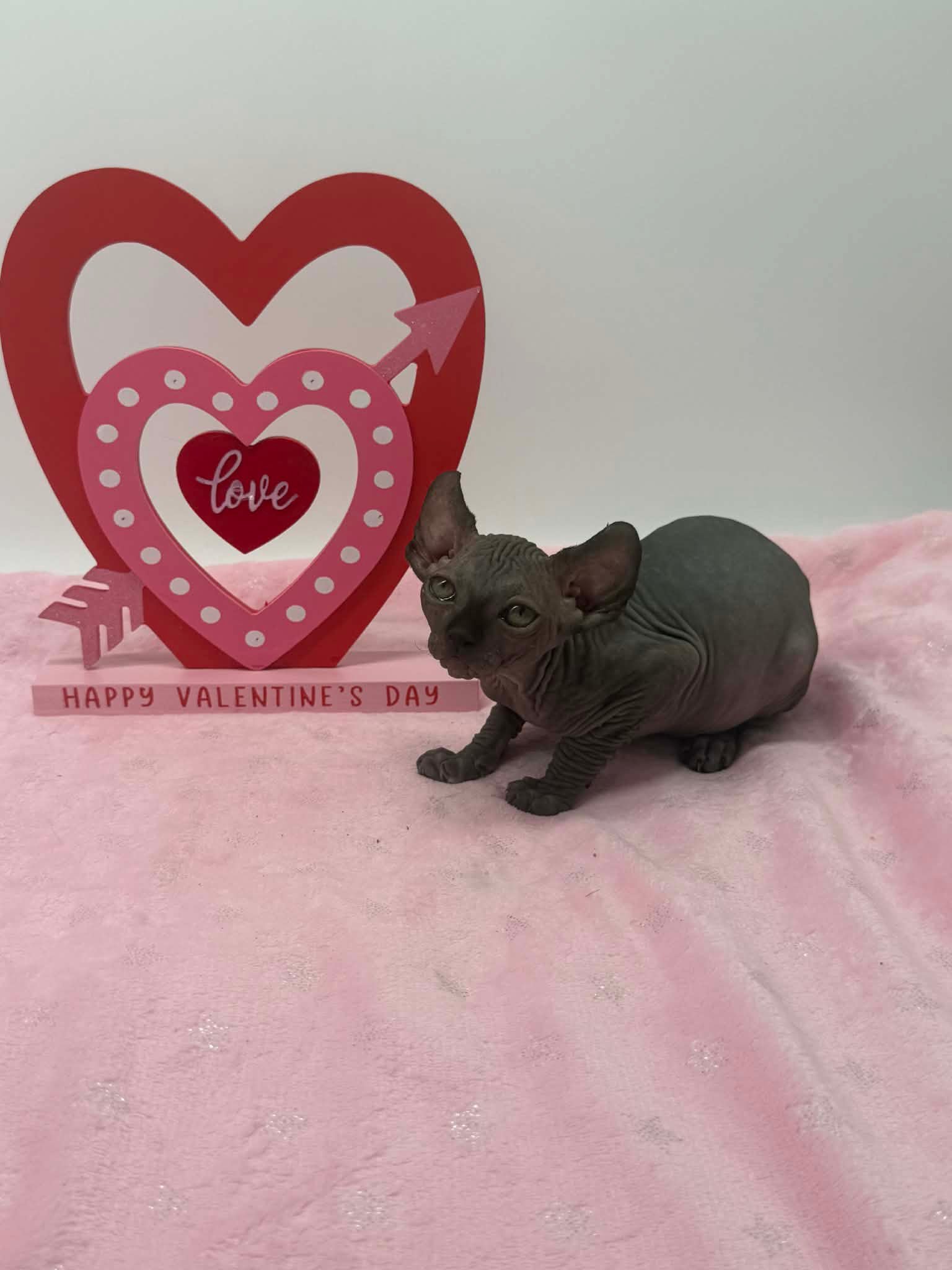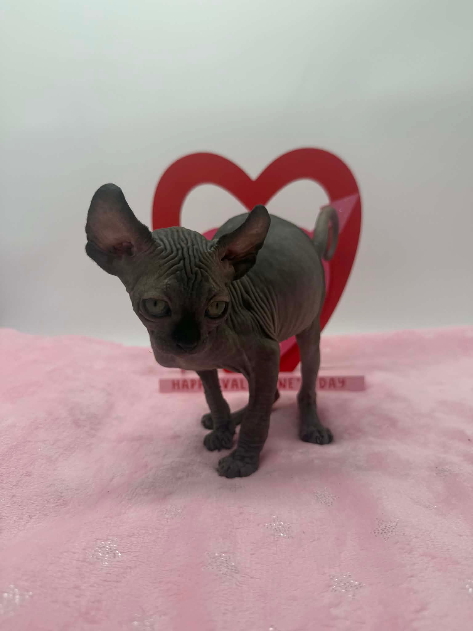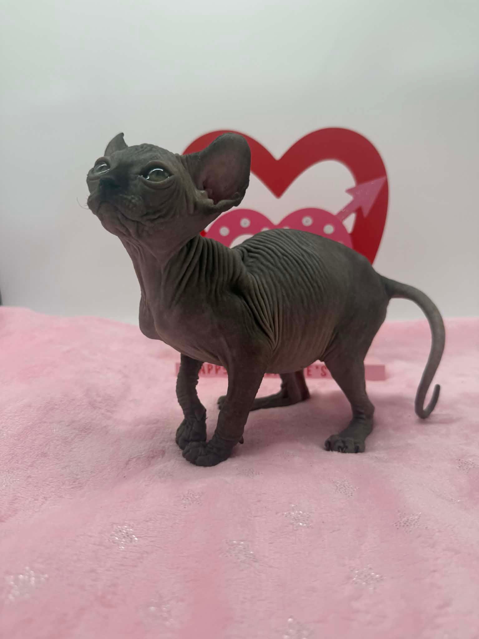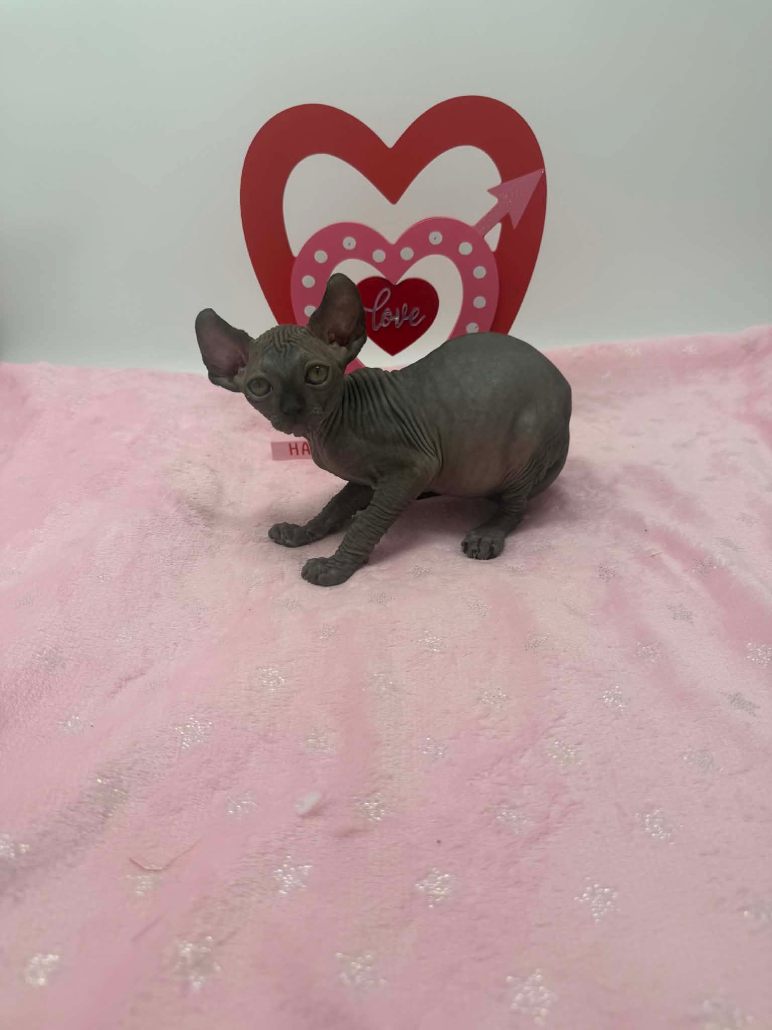 Velisse is a calm and exceptionally sweet black Elf Sphynx who loves being held, kissed, and cuddled. A gentle soul with an affectionate gaze, sheโ€™s the perfect lap kitten for someone seeking a true cuddle companion.