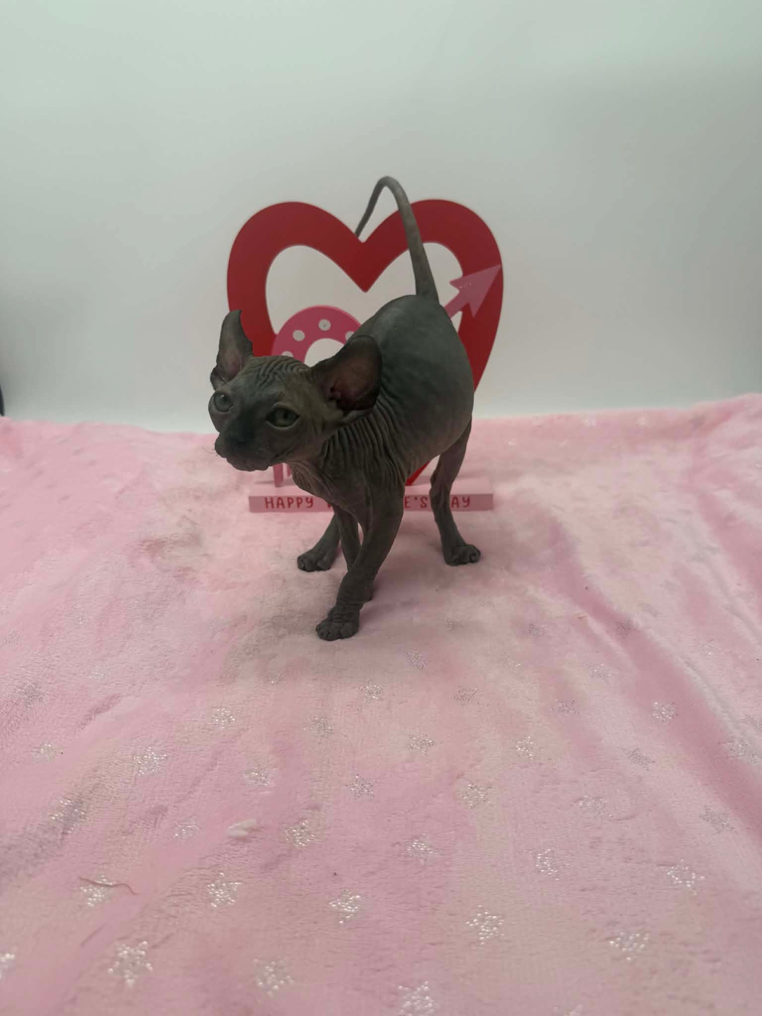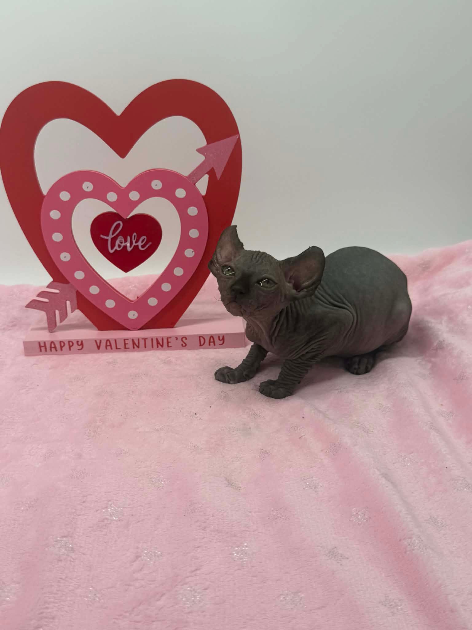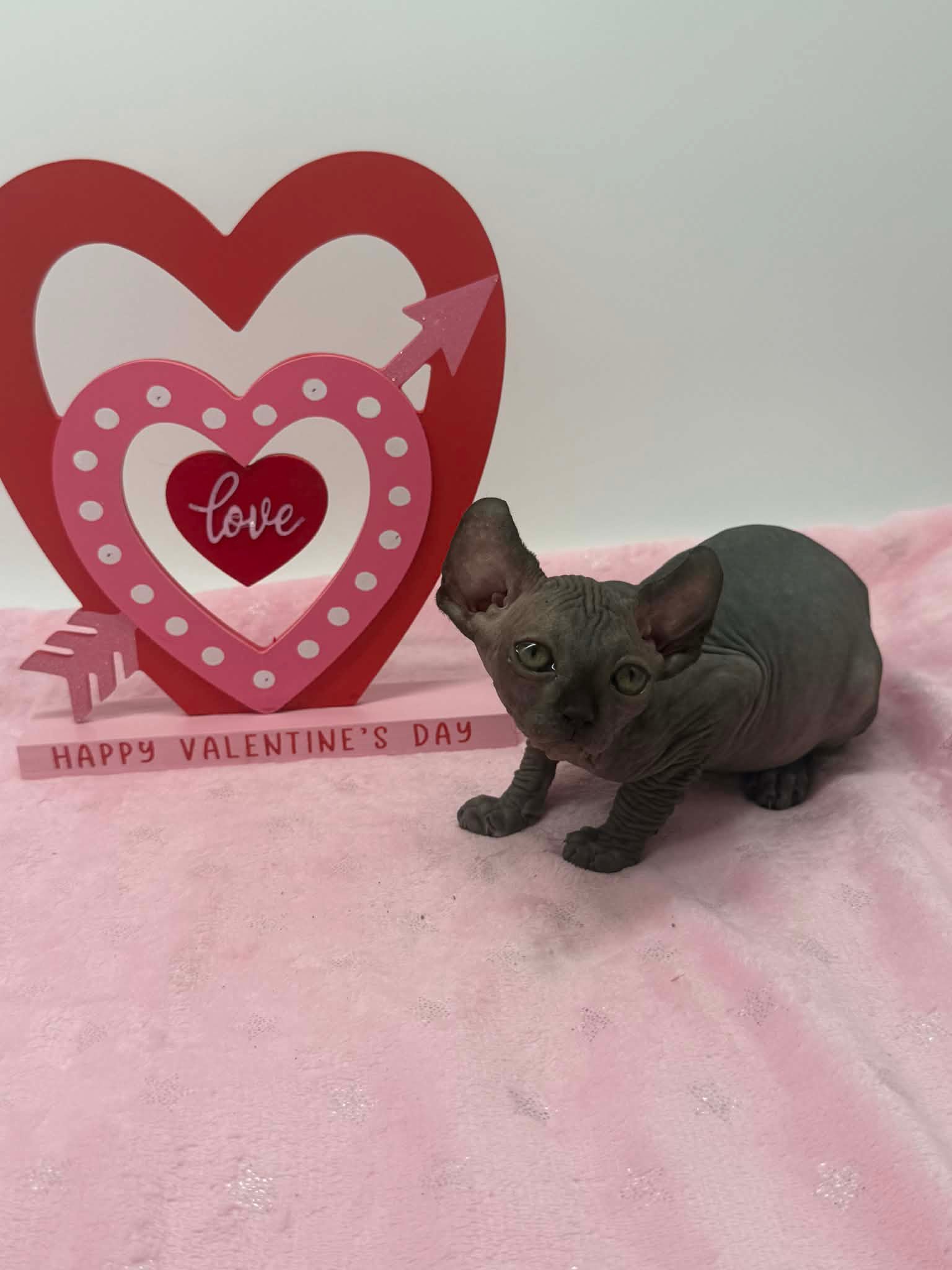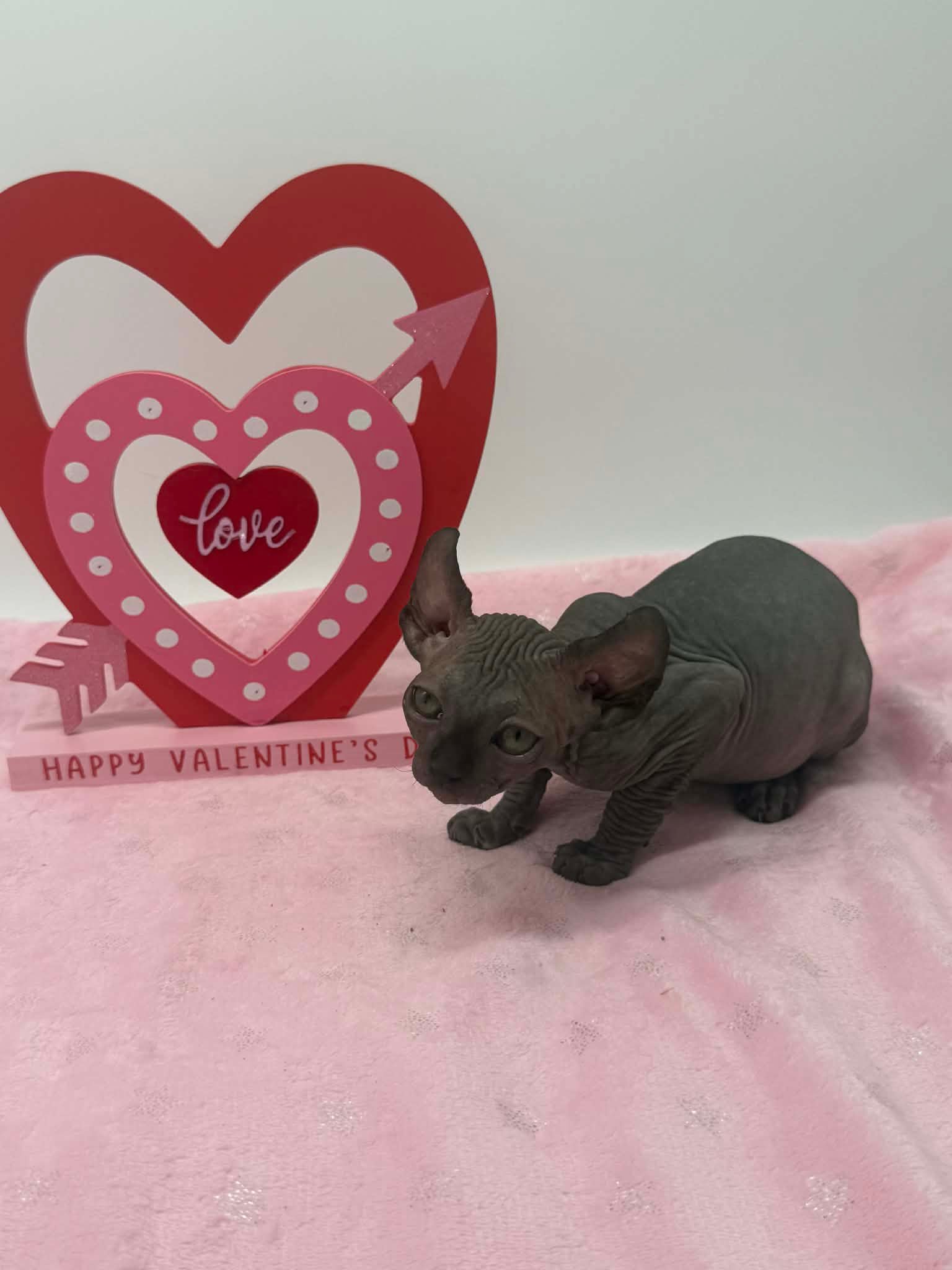 Velisse is a calm and exceptionally sweet black Elf Sphynx who loves being held, kissed, and cuddled. A gentle soul with an affectionate gaze, sheโ€™s the perfect lap kitten for someone seeking a true cuddle companion.