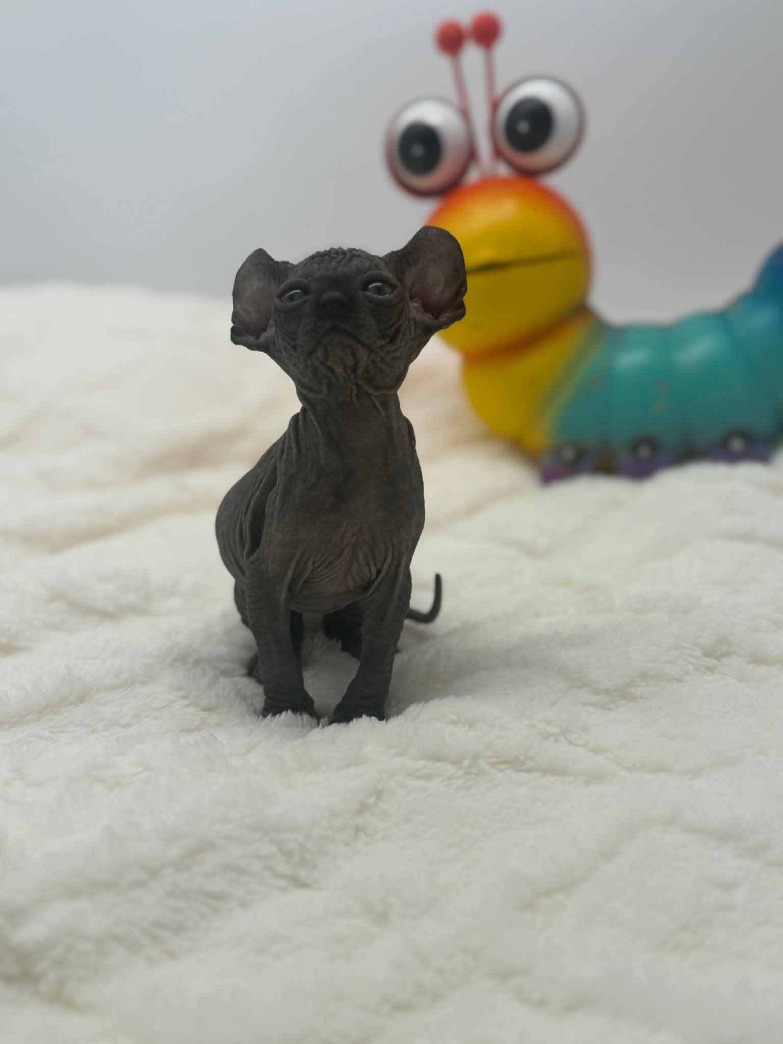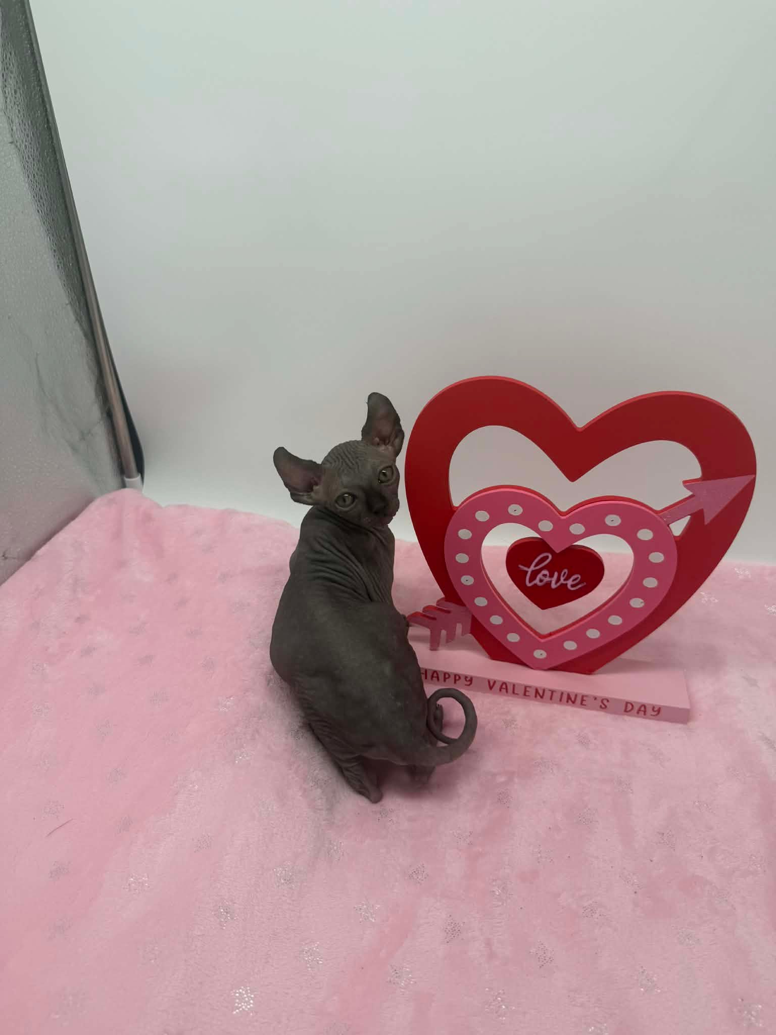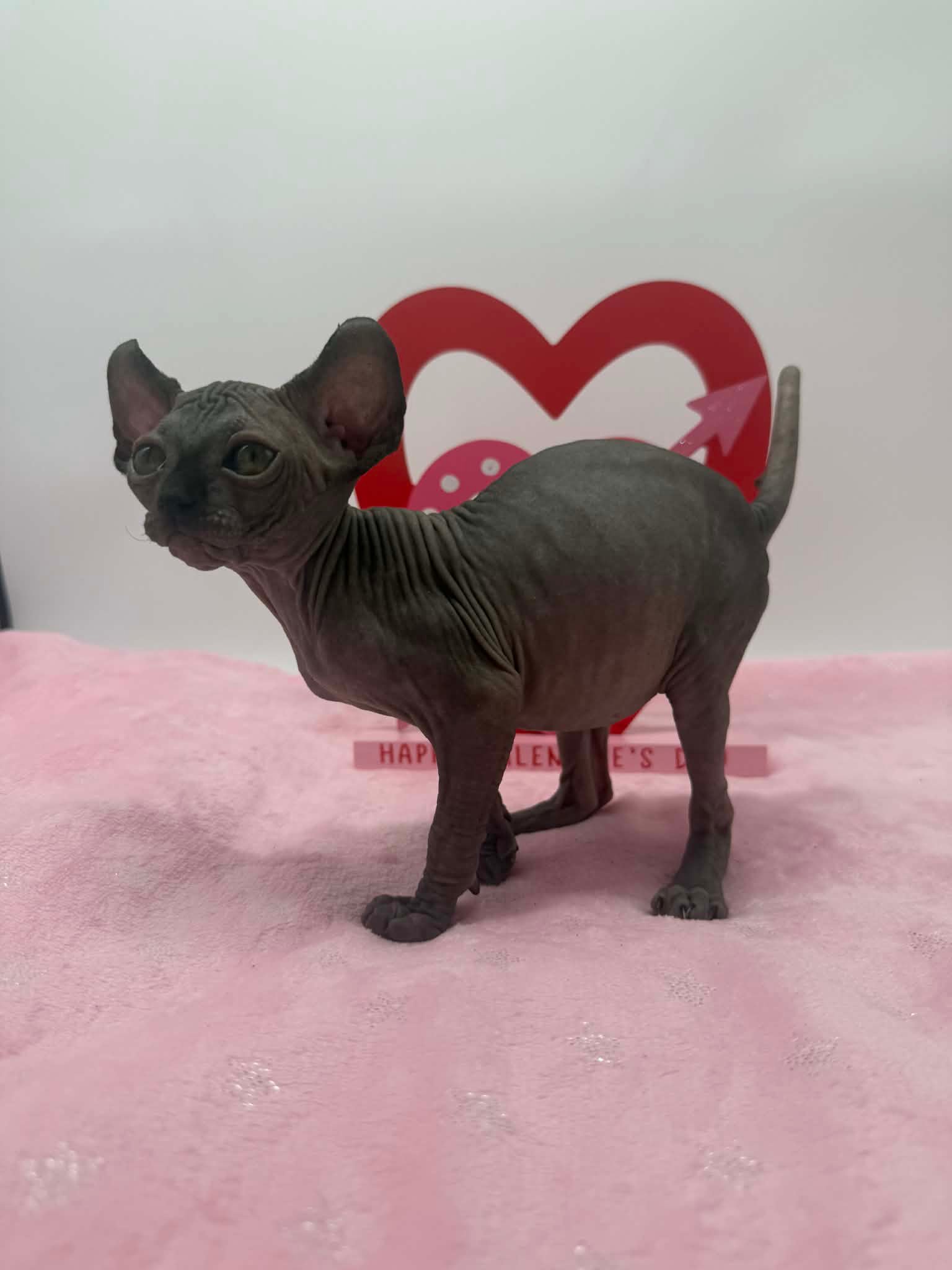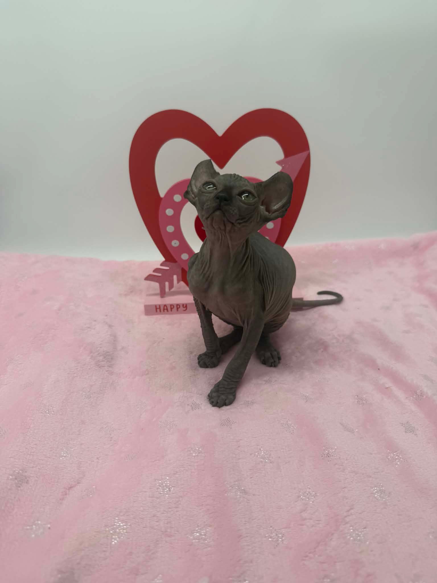 Velisse is a calm and exceptionally sweet black Elf Sphynx who loves being held, kissed, and cuddled. A gentle soul with an affectionate gaze, sheโ€™s the perfect lap kitten for someone seeking a true cuddle companion.