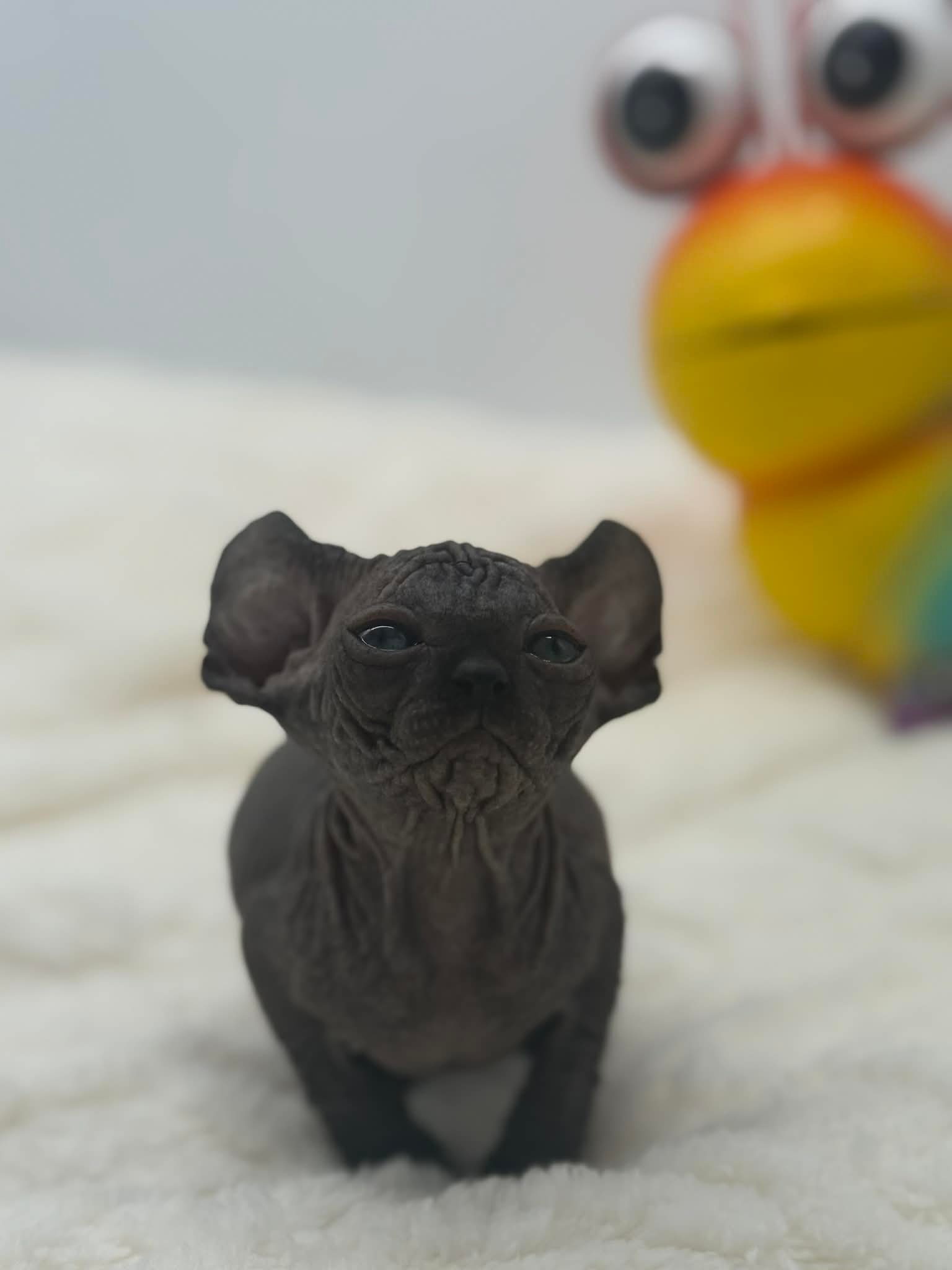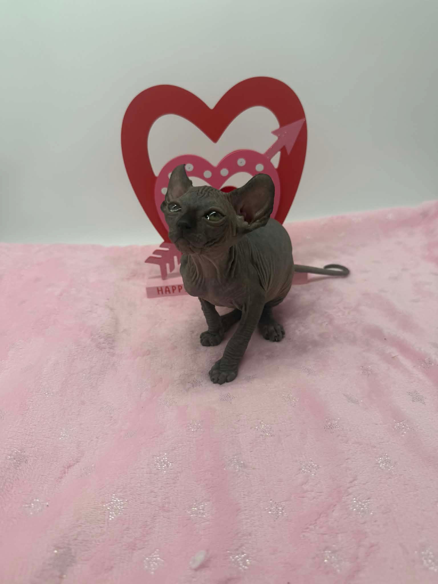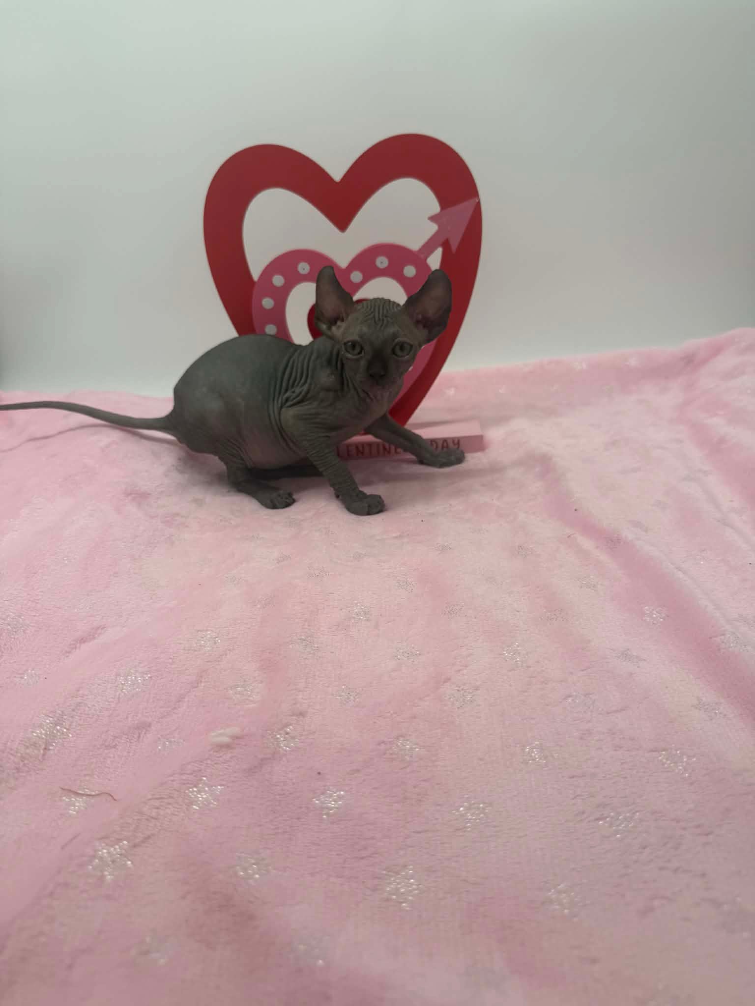 Velisse is a breathtaking black Elf Sphynx kitten with the kind of gentle soul that instantly melts hearts. With her calm disposition and naturally affectionate nature, she truly shines when sheโ€™s being held close. Velisse adores kisses and will happily settle into your arms, gazing up at you with her soulful eyes as if sheโ€™s quietly taking in every moment. This exceptionally sweet girl thrives on connection and human affection. She isnโ€™t demanding or high-energyโ€”instead, she prefers soft cuddles, warm laps, and quiet bonding time. Velisse has a unique habit of lovingly staring at and admiring her person while being held, creating a deep emotional connection that Sphynx lovers cherish. Velisse will make the perfect cuddle companion for someone seeking an extremely affectionate, gentle, and emotionally intuitive Sphynx kitten. She is ideal for a home that values closeness, calm energy, and a true lap cat experience. In my opinion, she is the kind of kitten that becomes not just a pet, but a constant, comforting presence.