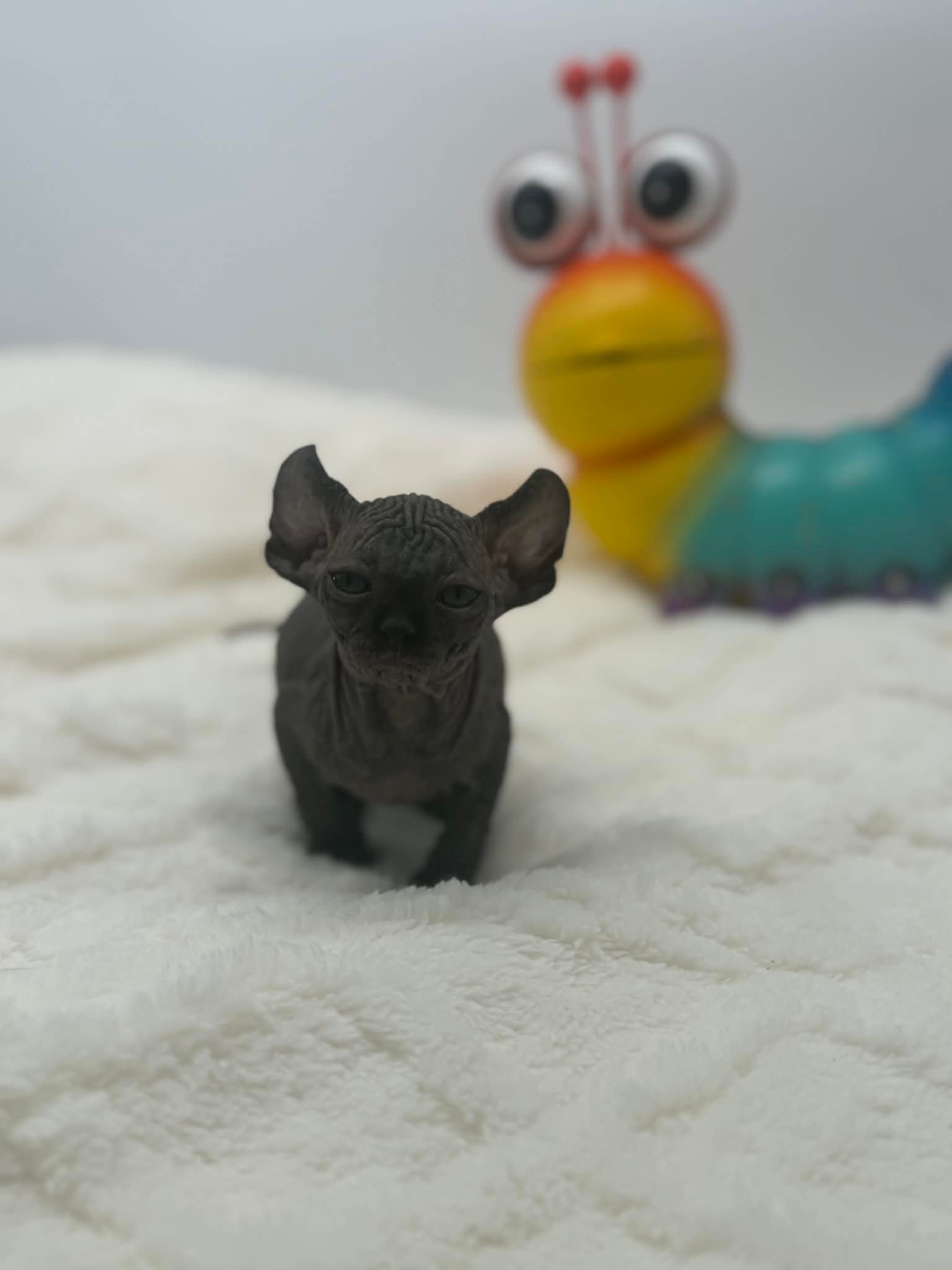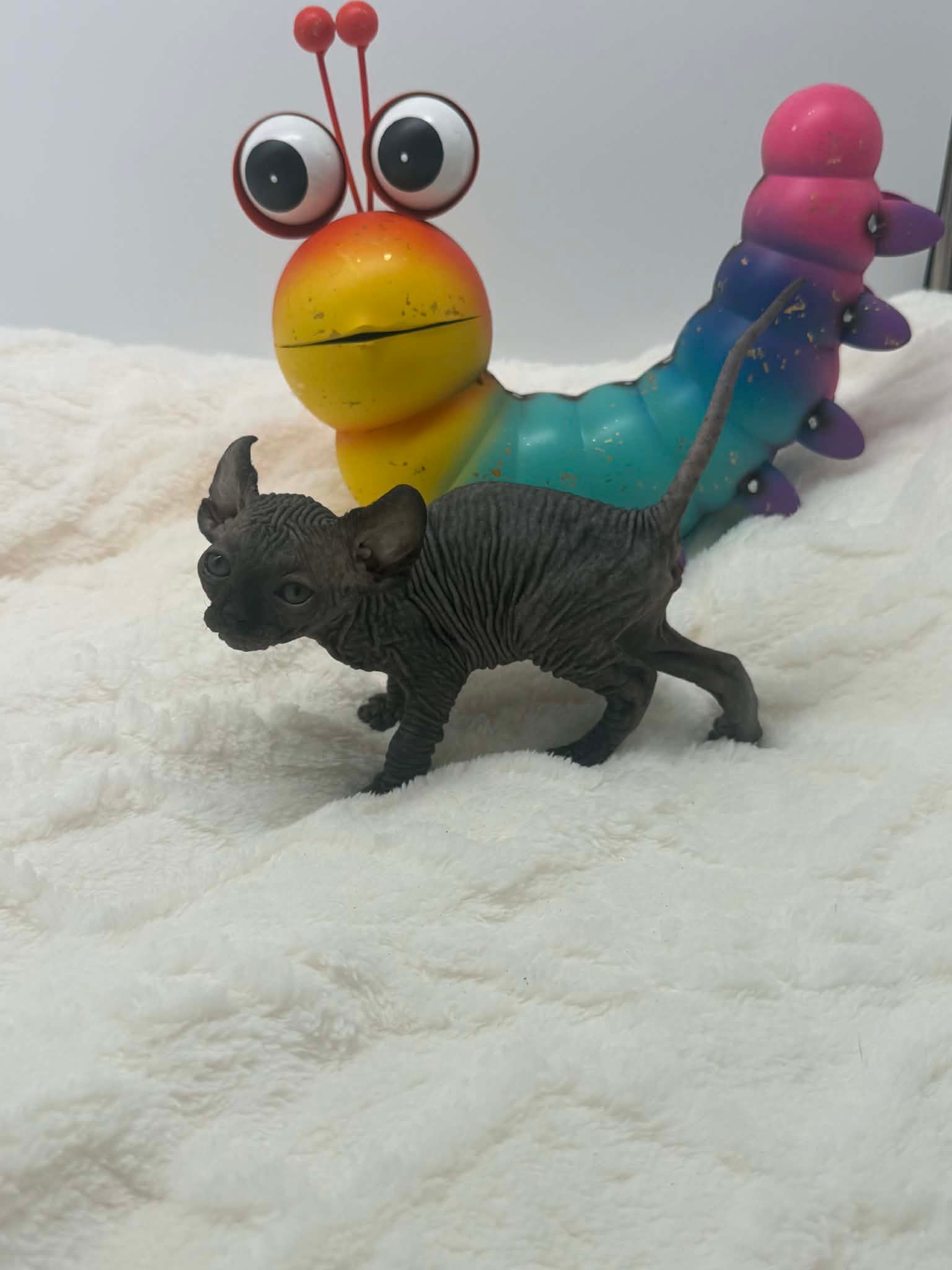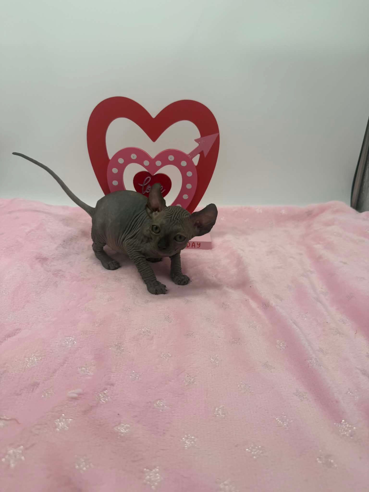 Velisse is a breathtaking black Elf Sphynx kitten with the kind of gentle soul that instantly melts hearts. With her calm disposition and naturally affectionate nature, she truly shines when sheโ€™s being held close. Velisse adores kisses and will happily settle into your arms, gazing up at you with her soulful eyes as if sheโ€™s quietly taking in every moment. This exceptionally sweet girl thrives on connection and human affection. She isnโ€™t demanding or high-energyโ€”instead, she prefers soft cuddles, warm laps, and quiet bonding time. Velisse has a unique habit of lovingly staring at and admiring her person while being held, creating a deep emotional connection that Sphynx lovers cherish. Velisse will make the perfect cuddle companion for someone seeking an extremely affectionate, gentle, and emotionally intuitive Sphynx kitten. She is ideal for a home that values closeness, calm energy, and a true lap cat experience. In my opinion, she is the kind of kitten that becomes not just a pet, but a constant, comforting presence.