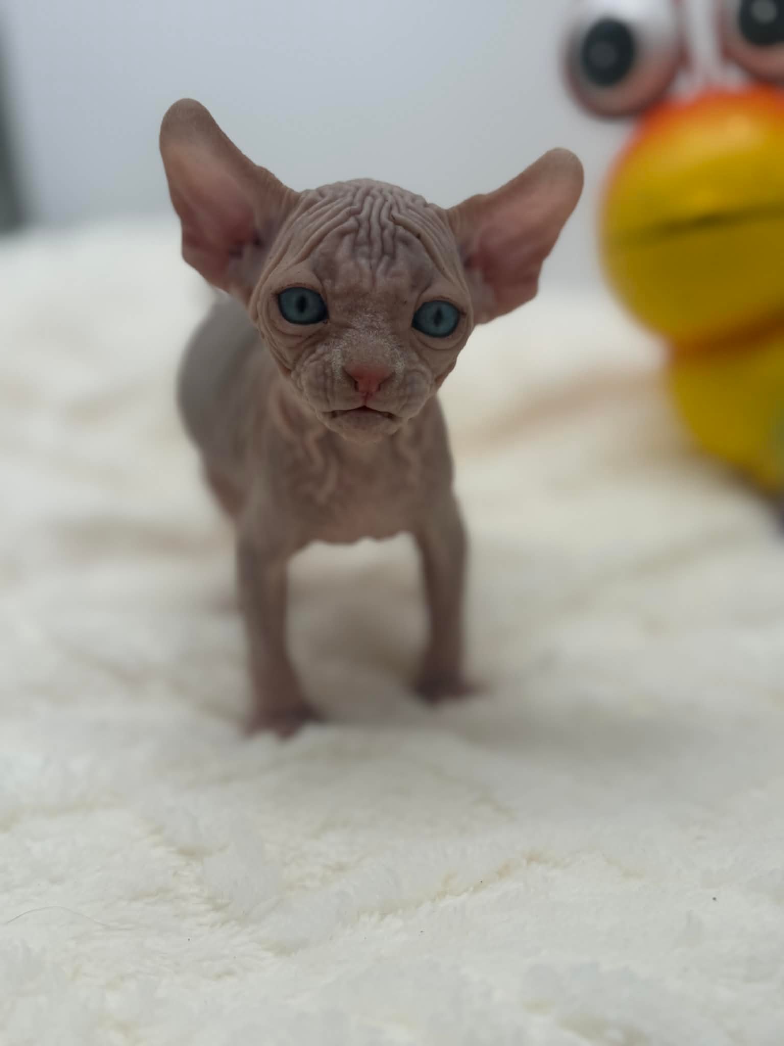 Meet Purradox Vermello, a striking red and white Elf Sphynx kitten whose presence is impossible to miss. Vermello is the largest kitten in his litter and the natural group leader, carrying himself with confidence, curiosity, and a calm, steady temperament that draws others to him. This handsome boy is more than just beautiful. He is deeply affectionate, people-oriented, and known for his constant, soothing purr. Vermello thrives on human connection and enjoys being closeโ€”whether that means curling up for cuddles or supervising daily activities like a tiny, hairless manager. In my opinion, his personality is the perfect blend of strength and sweetness, making him an exceptional companion. His vivid blue eyes contrast beautifully against his warm red and white skin, while his signature Elf ears give him a whimsical, elegant look that Elf Sphynx lovers adore. Vermello has been raised with intentional socialization, routine handling, and enrichment to support a confident, well-adjusted temperament.