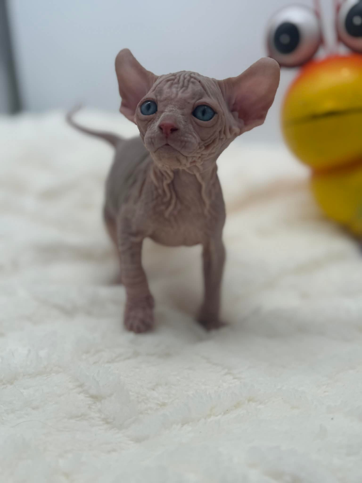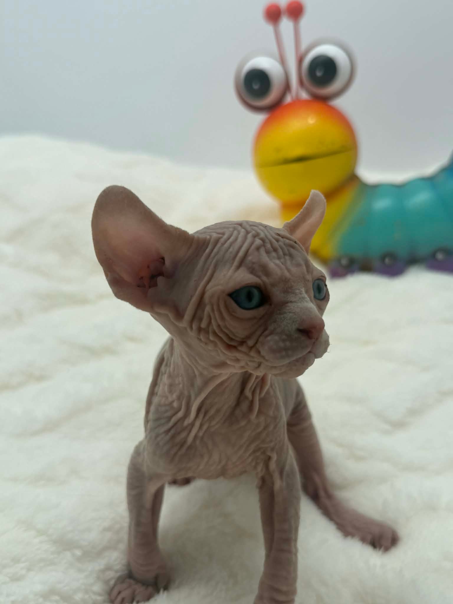 Purradox Vermello is a stunning red and white Elf Sphynx male kitten with bright blue eyes and a confident, affectionate personality. As the largest kitten in his litter, heโ€™s a natural leader who loves attention, enjoys cuddles, and purrs constantly. Vermello is a people-oriented companion with both presence and sweetnessโ€”perfect for a home seeking an exceptional Sphynx kitten.