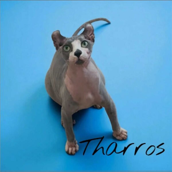 Tharros is both friendly and affectionate, always ready for cuddles after playtime. His Elf ears give him a uniquely endearing look, and his smooth blue-and-white skin makes him a stunning example of the Elf Sphynx breed.