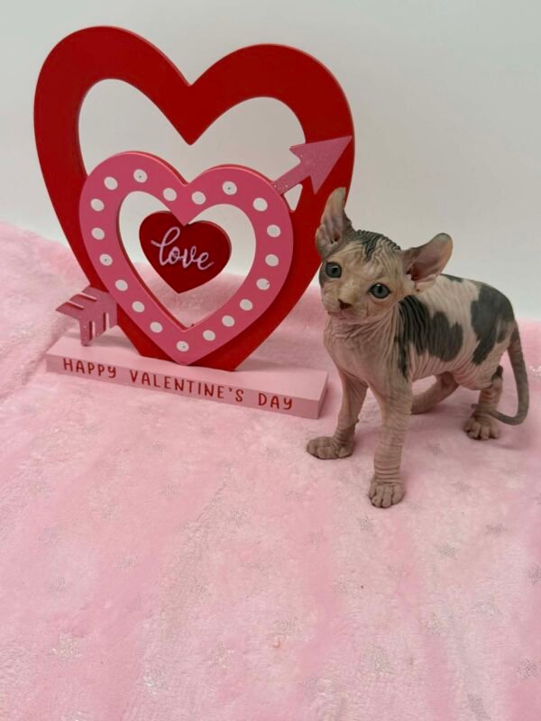 This sweet girl enjoys affection, cozy moments, and quiet companionship. Whether sheโs curled up beside you or softly watching the world with her expressive eyes, Essence radiates kindness and contentment. Her calm yet loving nature makes her a wonderful choice for a home looking for a truly affectionate and emotionally connected Sphynx.