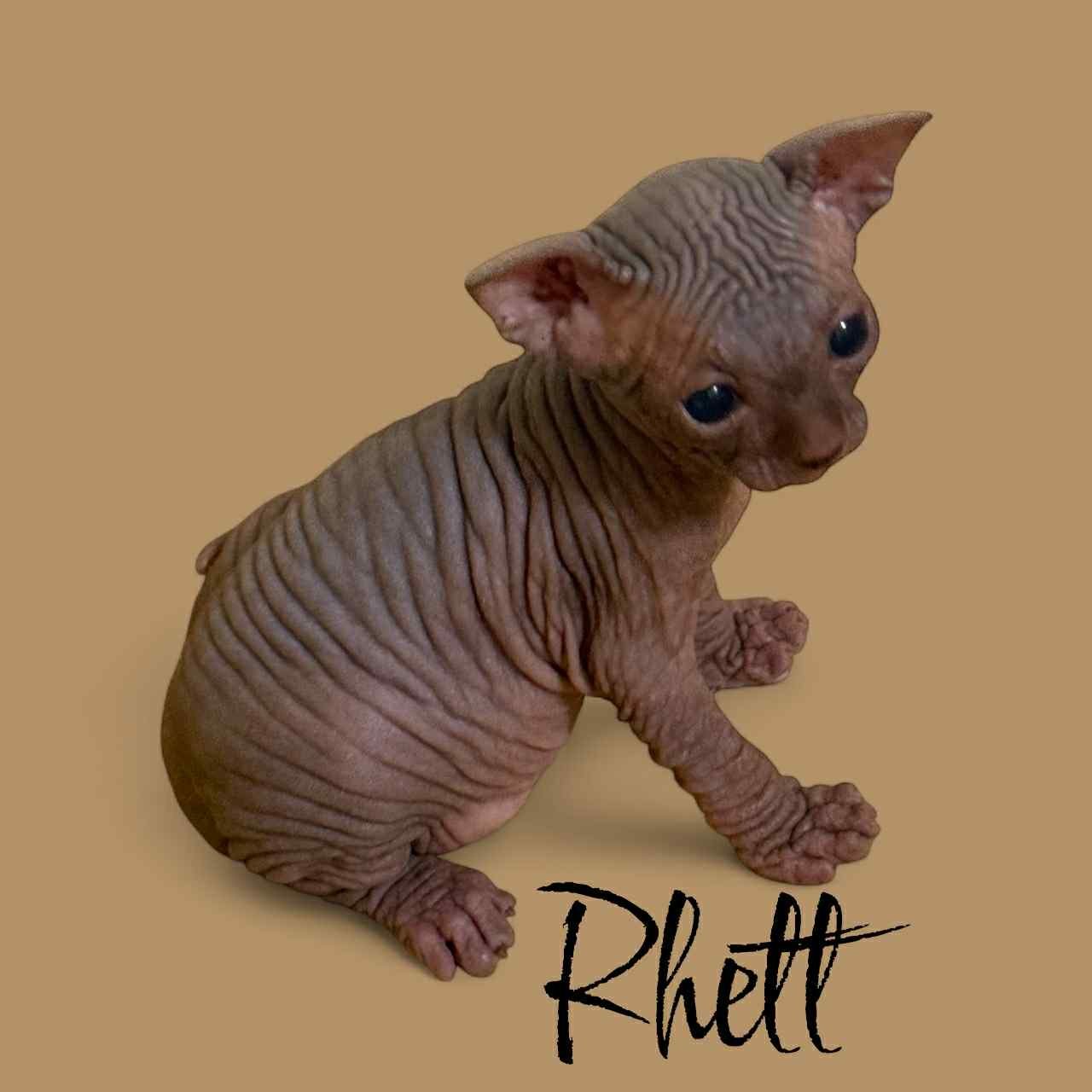 Rhett is a stunning Modern Chocolate Sphynx kitten with extra wrinkles and a personality as sweet as his rich, cocoa coat. From the moment he opens his eyes, he’s eager to engage with everyone around him — chirping and meowing his way into your heart. This charming boy loves to be held, carried, and included in your daily routines.